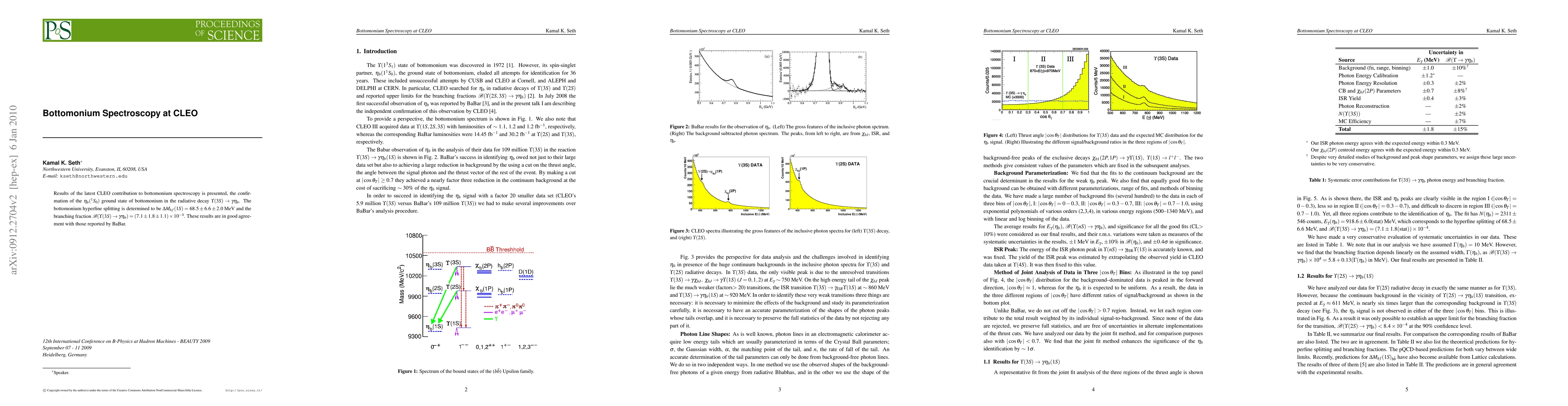 Results of the latest CLEO contribution to bottomonium spectroscopy is presented, the confirmation of the eta_b(1S0) ground state of bottomonium in the radiative decay Upsilon(3S) -> gamma eta_b. The bottomonium hyperfine splitting is determined to be Delta M_hf(1S) = 68.5+-6.6+-2.0 MeV and the branching fraction B(Upsilon(3S) -> gamma eta_b=(7.1+-1.8+-1.1)x10^-4. These results are in good agreement with those reported by BaBar.