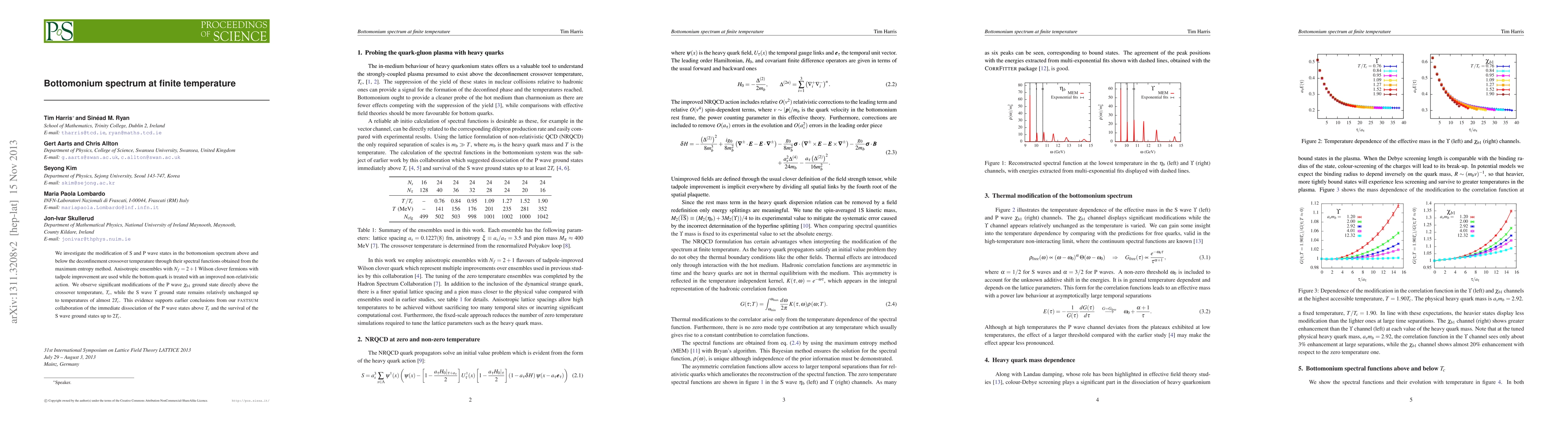 We investigate the modification of S and P wave states in the bottomonium spectrum above and below the deconfinement crossover temperature through their spectral functions obtained from the maximum entropy method. Anisotropic ensembles with $N_f=2+1$ Wilson clover fermions with tadpole-improvement are used while the bottom quark is treated with an improved non-relativistic action. We observe significant modifications of the P wave $\chi_{b1}$ ground state directly above the crossover temperature, $T_c$, while the S wave $\Upsilon$ ground state remains relatively unchanged up to temperatures of almost $2T_c$. This evidence supports earlier conclusions from our FASTSUM collaboration of the immediate dissociation of the P wave states above $T_c$ and the survival of the S wave ground states up to $2T_c$.