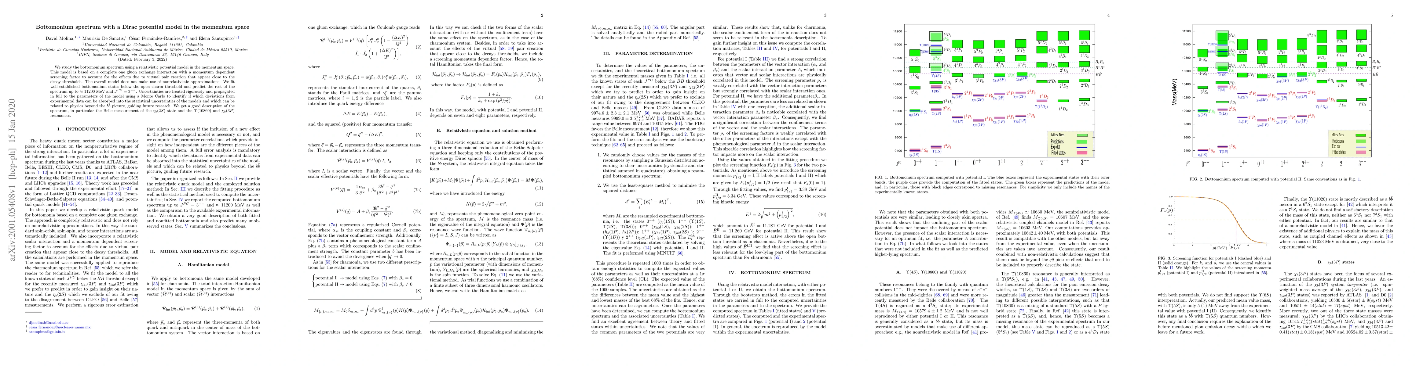 We study the bottomonium spectrum using a relativistic potential model in the momentum space. This model is based on a complete one gluon exchange interaction with a momentum dependent screening factor to account for the effects due to virtual pair creation that appear close to the decay thresholds. The overall model does not make use of nonrelativistic approximations. We fit well established bottomonium states below the open charm threshold and predict the rest of the spectrum up to $\approx 11200$ MeV and $J^{PC}=3^{--}$. Uncertainties are treated rigorously and propagated in full to the parameters of the model using a Monte Carlo to identify if which deviations from experimental data can be absorbed into the statistical uncertainties of the models and which can be related to physics beyond the $b\bar{b}$ picture, guiding future research. We get a good description of the spectrum, in particular the Belle measurement of the $\eta_b(2S)$ state and the $\Upsilon(10860)$ and $\chi_b(3P)$ resonances.