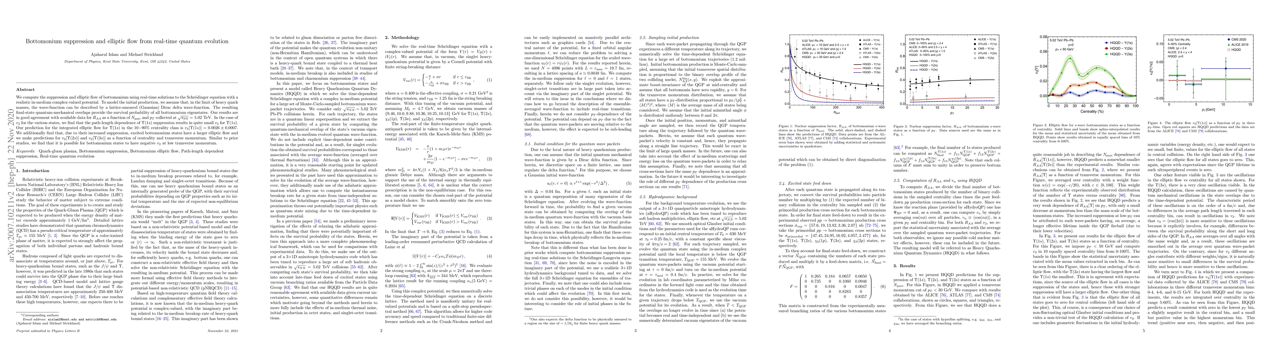 This study investigates the suppression and elliptic flow of bottomonium in heavy-ion collisions using real-time quantum evolution models. The research predicts small elliptic flow for $\Upsilon(1s)$ due to path-length dependence, and larger elliptic flow for excited states, with predictions for $v_2[\Upsilon(1s)]$, $v_2[\Upsilon(2s)]$, and $v_2[\Upsilon(3s)]$ aligning with available data.