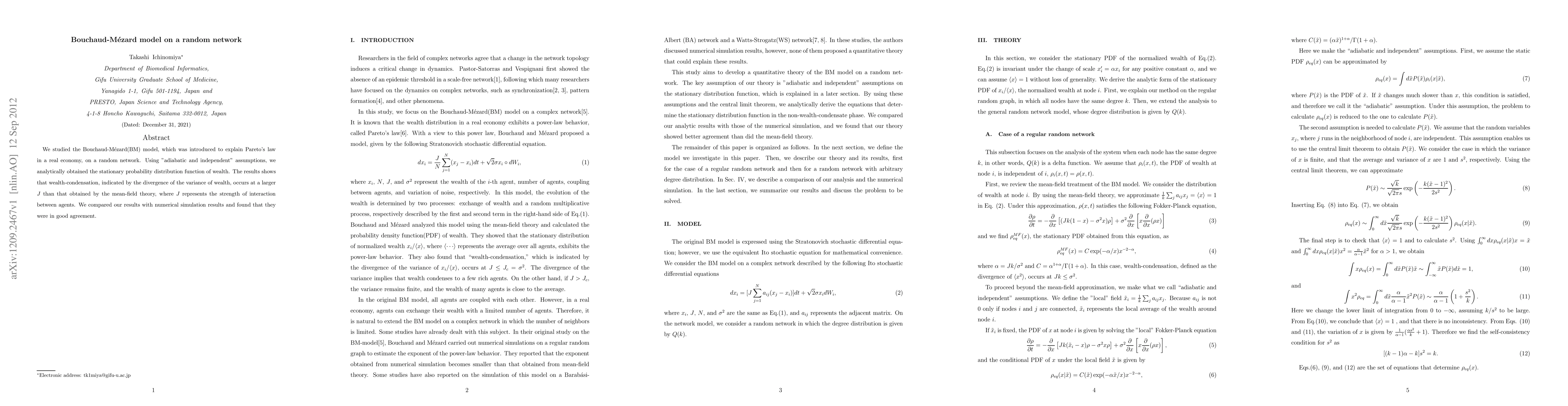 We studied the Bouchaud-M\'ezard(BM) model, which was introduced to explain Pareto's law in a real economy, on a random network. Using "adiabatic and independent" assumptions, we analytically obtained the stationary probability distribution function of wealth. The results shows that wealth-condensation, indicated by the divergence of the variance of wealth, occurs at a larger $J$ than that obtained by the mean-field theory, where $J$ represents the strength of interaction between agents. We compared our results with numerical simulation results and found that they were in good agreement.