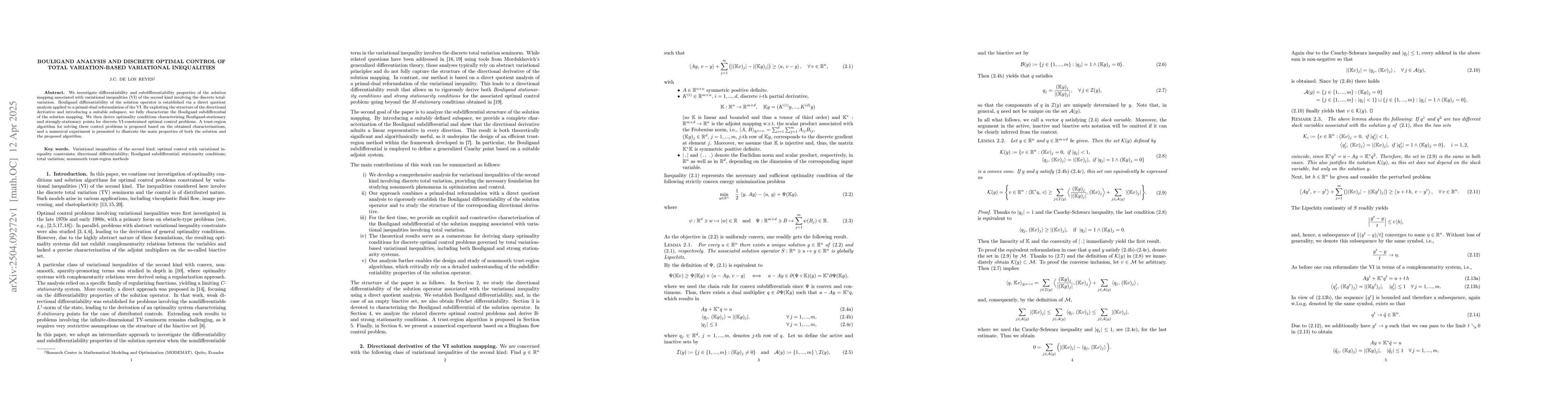 The paper presents a novel approach to characterize the Bouligand subdifferential of the solution operator for discrete total variation-based variational inequalities, which is essential for deriving optimality conditions in discrete optimal control problems.