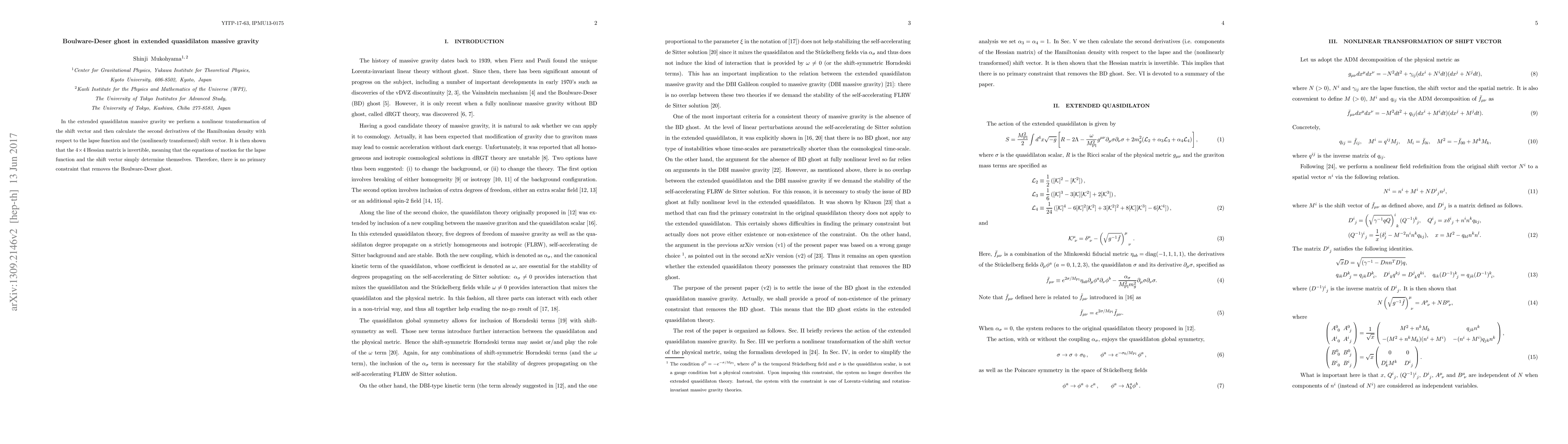 In the extended quasidilaton massive gravity we perform a nonlinear transformation of the shift vector and then calculate the second derivatives of the Hamiltonian density with respect to the lapse function and the (nonlinearly transformed) shift vector. It is then shown that the $4\times 4$ Hessian matrix is invertible, meaning that the equations of motion for the lapse function and the shift vector simply determine themselves. Therefore, there is no primary constraint that removes the Boulware-Deser ghost.