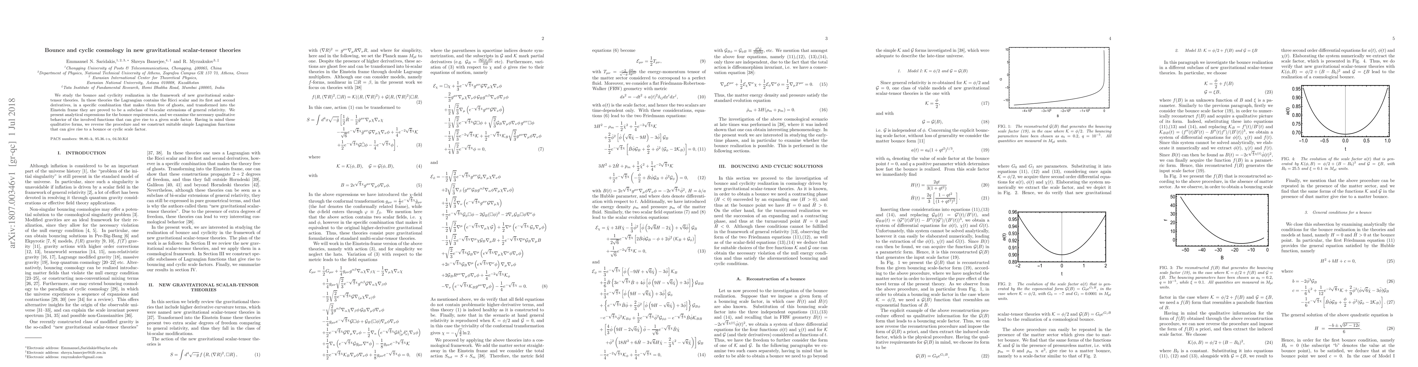 This paper explores the potential for a bounce and cyclic cosmology within new gravitational scalar-tensor theories, featuring a Lagrangian with Ricci scalar and its derivatives. It provides analytical expressions for bounce conditions and constructs suitable Lagrangian functions to achieve cyclic scale factors.