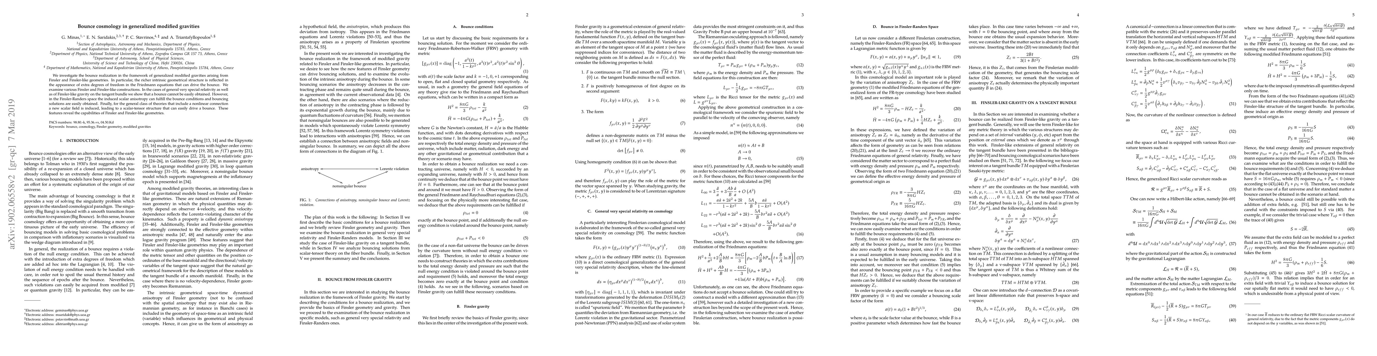 This paper explores bounce cosmology within generalized modified gravities from Finsler and Finsler-like geometries, finding that while certain constructions like general very special relativity and Finsler-like gravity do not easily support a bounce, Finsler-Randers space and nonlinear connections can induce a scalar field leading to bouncing solutions.