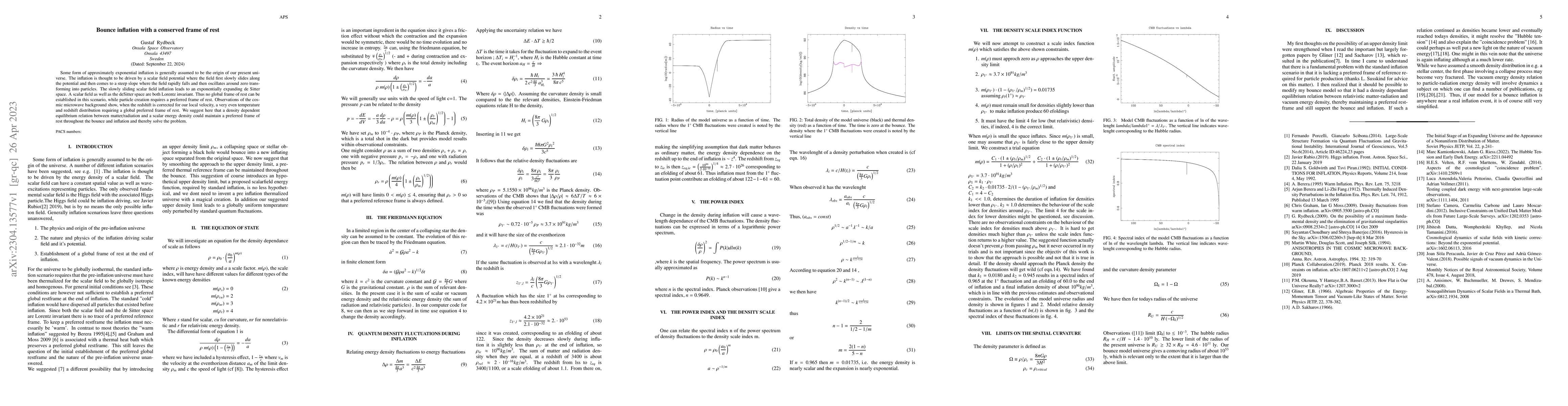 Some form of approximately exponential inflation is generally assumed to be the origin of our present universe. The inflation is thought to be driven by a scalar field potential where the field first slowly slides along the potential and then comes to a steep slope where the field rapidly falls and then oscillates around zero transforming into particles. The slowly sliding scalar field inflation leads to an exponentially expanding de Sitter space. A scalar field as well as the deSitter space are both Lorentz invariant. Thus no global frame of rest can be established in this scenario, while particle creation requires a preferred frame of rest. Observations of the cosmic microwave background show, when the redshift is corrected for our local velocity, a very even temperature and redshift distribution requiring a global preferred frame of rest. We suggest here that a density dependent equilibrium relation between matter/radiation and a scalar energy density could maintain a preferred frame of rest throughout the bounce and inflation and thereby solve the problem.