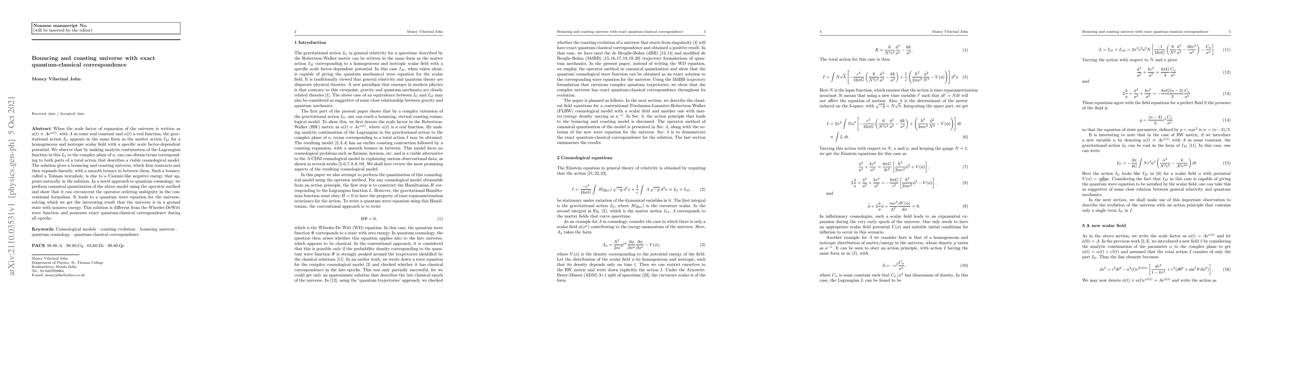 This paper proposes a cosmological model where the universe undergoes a bouncing and coasting phase, transitioning smoothly from contraction to linear expansion. The model achieves exact quantum-classical correspondence by using analytic continuation and operator quantization, resulting in a ground state universe with nonzero energy.