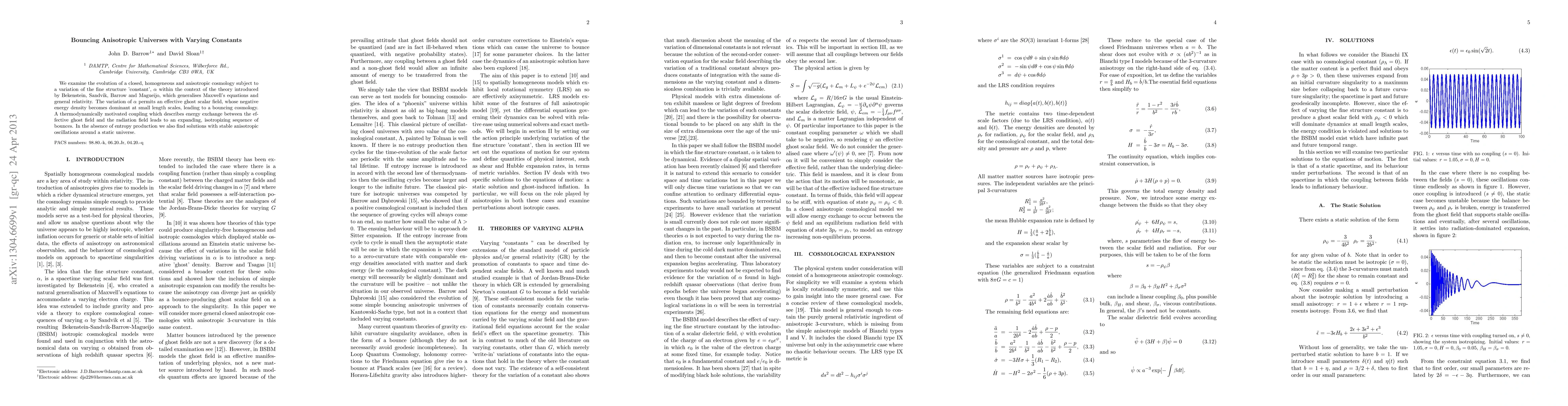 This paper explores a closed, anisotropic cosmological model where the fine structure constant varies, leading to a bouncing universe through a ghost scalar field. The study finds that thermodynamically motivated energy exchange results in expanding, isotropizing bounces or stable anisotropic oscillations.