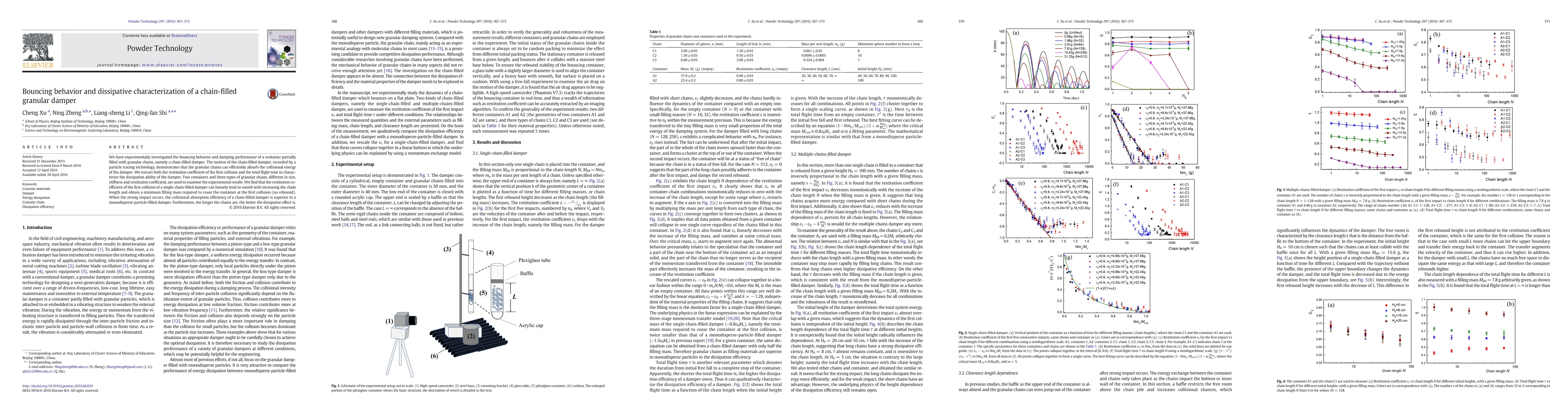 This study experimentally investigates the bouncing behavior and damping performance of a chain-filled granular damper, finding that granular chains efficiently absorb collisional energy and that longer chains enhance dissipation efficiency. The research identifies a minimum filling mass needed to prevent rebound and demonstrates superior absorption compared to monodisperse-particle-filled dampers.