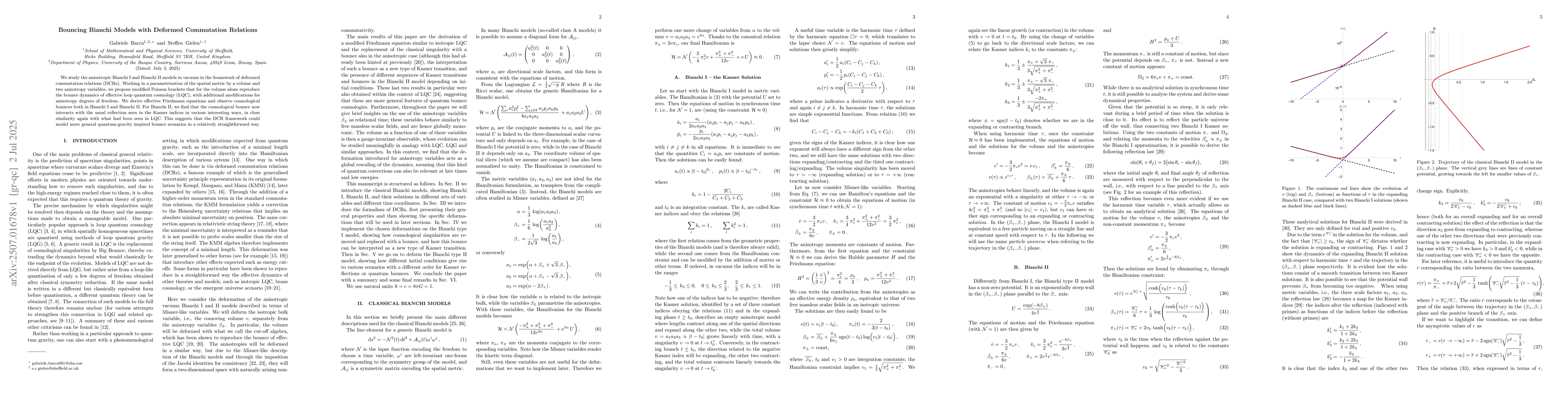 We study the anisotropic Bianchi I and Bianchi II models in vacuum in the framework of deformed commutation relations (DCRs). Working in a parametrisation of the spatial metric by a volume and two anisotropy variables, we propose modified Poisson brackets that for the volume alone reproduce the bounce dynamics of effective loop quantum cosmology (LQC), with additional modifications for anisotropy degrees of freedom. We derive effective Friedmann equations and observe cosmological bounces both in Bianchi I and Bianchi II. For Bianchi II, we find that the cosmological bounce now interacts with the usual reflection seen in the Kasner indices in various interesting ways, in close similarity again with what had been seen in LQC. This suggests that the DCR framework could model more general quantum-gravity inspired bounce scenarios in a relatively straightforward way.