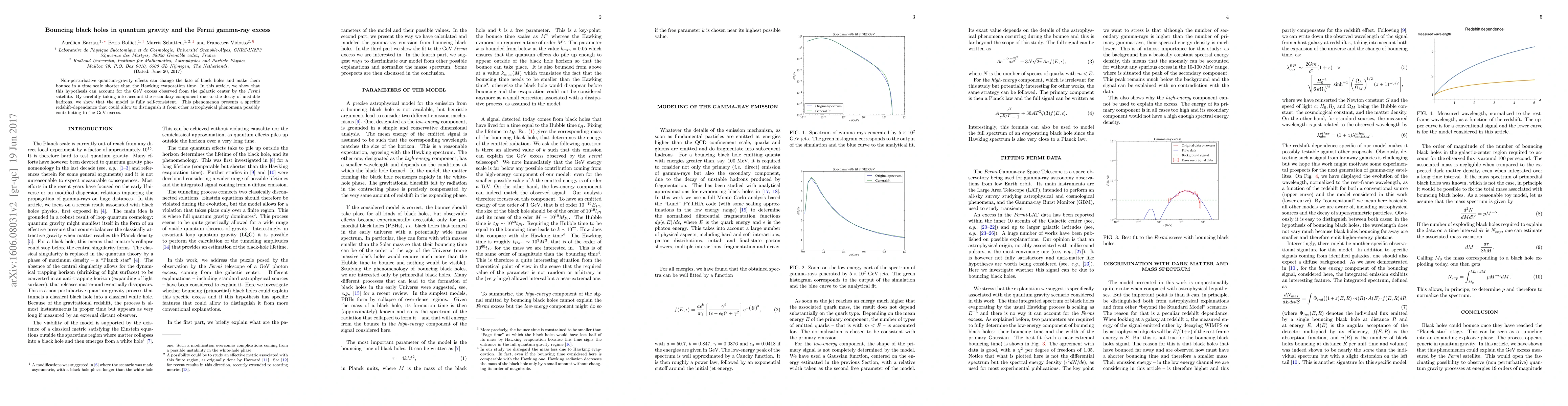 The paper proposes a model of bouncing black holes in quantum gravity to explain the GeV gamma-ray excess observed by the Fermi satellite. It considers non-perturbative quantum-gravity effects causing black holes to bounce within a timescale shorter than Hawking evaporation. The study models gamma-ray emission from bouncing black holes, taking into account both primary and secondary components from hadron decay, and fits this model to the Fermi excess data.
