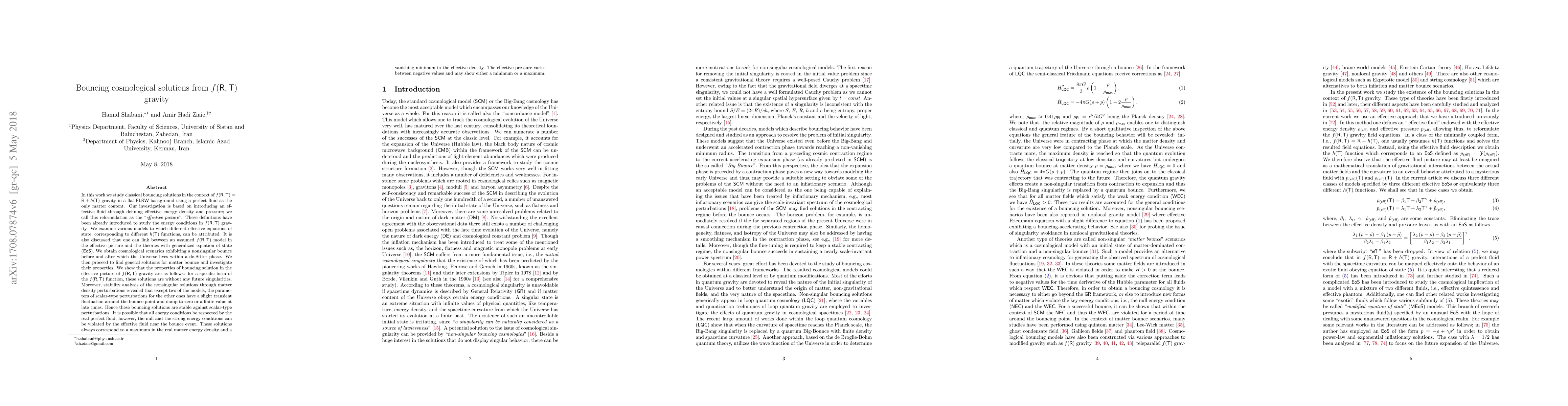 This paper explores bouncing cosmological solutions in $f(R,T)$ gravity using a perfect fluid in a flat FLRW background. It introduces an effective fluid approach to study nonsingular bounces leading to de-Sitter phases, demonstrating stability against scalar-type perturbations, while noting potential energy condition violations by the effective fluid near the bounce.