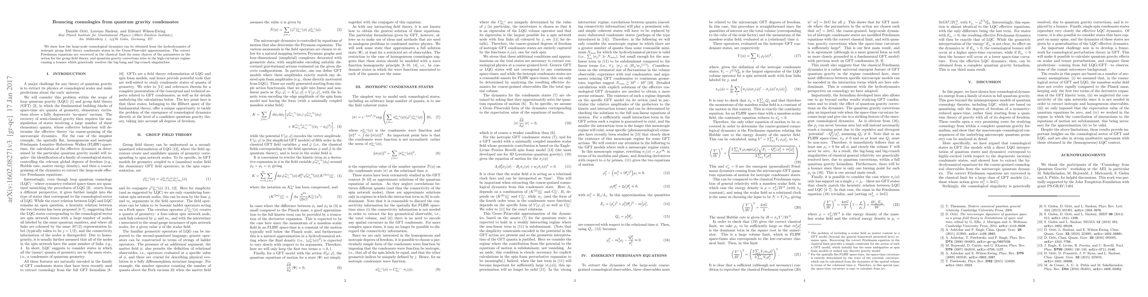 We show how the large-scale cosmological dynamics can be obtained from the hydrodynamics of isotropic group field theory condensate states in the Gross-Pitaevskii approximation. The correct Friedmann equations are recovered in the semi-classical limit for some choices of the parameters in the action for the group field theory, and quantum gravity corrections arise in the high-curvature regime causing a bounce which generically resolves the big-bang and big-crunch singularities.