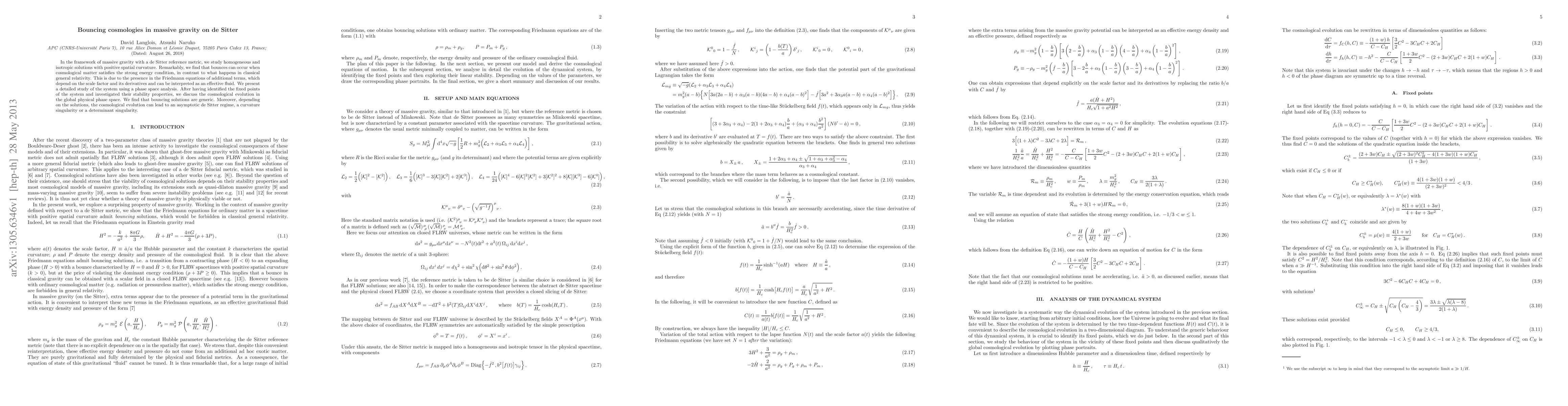 In massive gravity on de Sitter backgrounds, homogeneous and isotropic solutions with positive spatial curvature can exhibit bouncing behavior when matter satisfies the strong energy condition, unlike in classical general relativity. The presence of additional terms in the Friedmann equations, interpreted as an effective fluid, leads to this phenomenon.