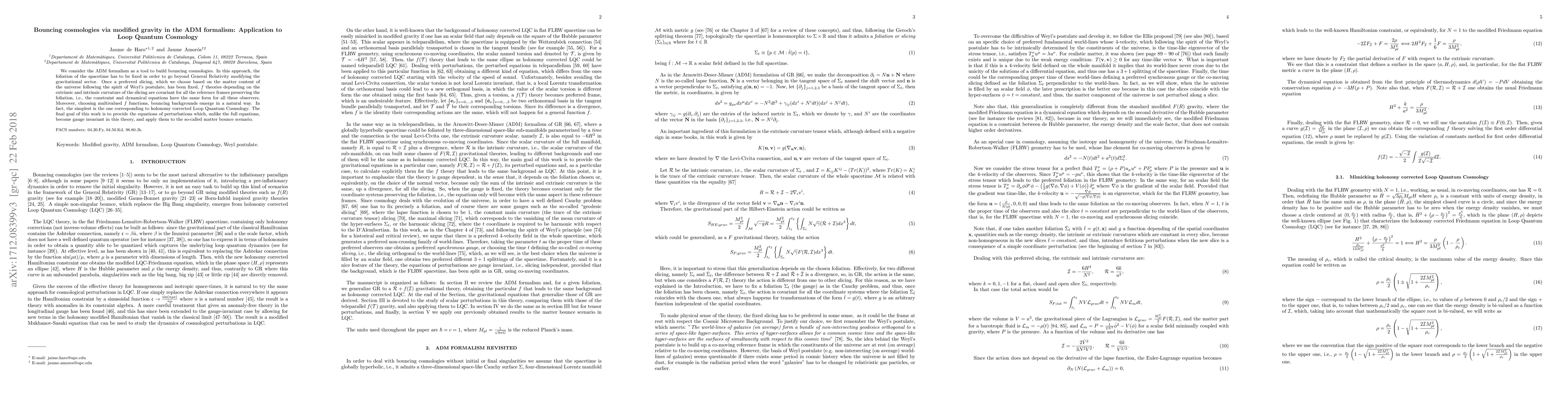 We consider the ADM formalism as a tool to build bouncing cosmologies. In this approach, the foliation of the spacetime has to be fixed in order to go beyond General Relativity modifying the gravitational sector. Once a preferred slicing, which we choose based on the matter content of the universe following the spirit of Weyl's postulate, has been fixed, $f$ theories depending on the extrinsic and intrinsic curvature of the slicing are covariant for all the reference frames preserving the foliation, i.e., the constraint and dynamical equations have the same form for all these observers. Moreover, choosing multivalued $f$ functions, bouncing backgrounds emerge in a natural way. In fact, the simplest is the one corresponding to holonomy corrected Loop Quantum Cosmology. The final goal of this work is to provide the equations of perturbations which, unlike the full equations, become gauge invariant in this theory, and apply them to the so-called matter bounce scenario.