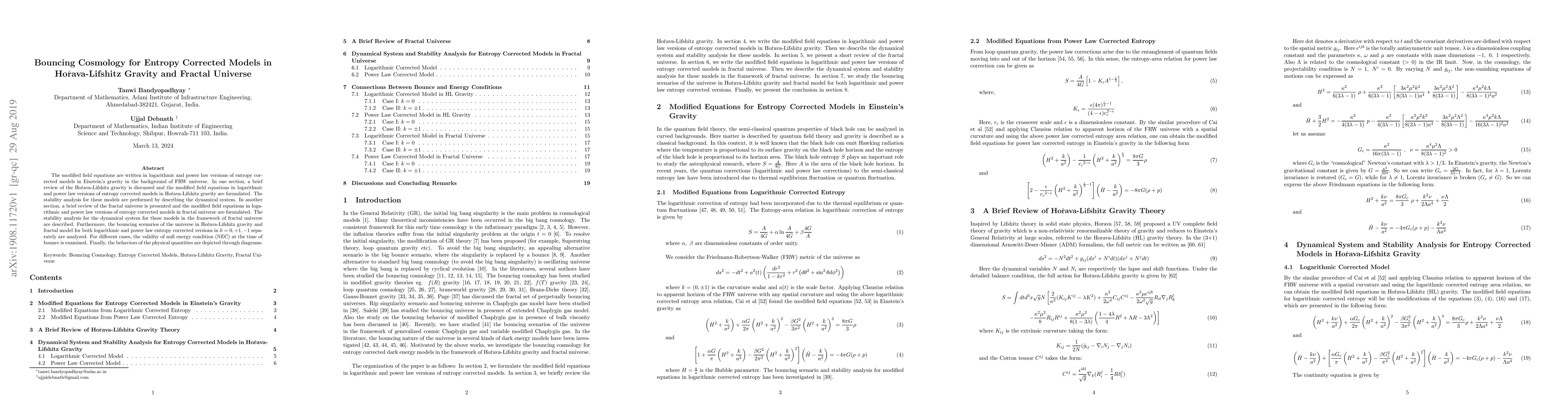 This paper explores modified field equations in Hoçrava-Lifshitz gravity and fractal universe, analyzing stability and bouncing scenarios with a focus on entropy-corrected models.