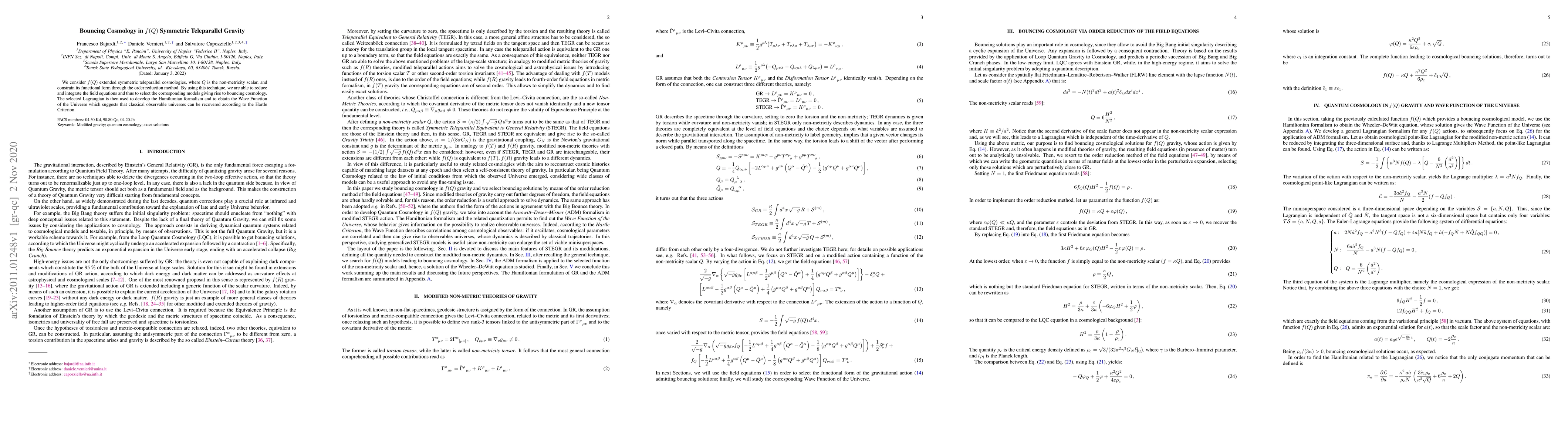 We consider f(Q) extended symmetric teleparallel cosmologies, where Q is the non-metricity scalar, and constrain its functional form through the order reduction method. By using this technique, we are able to reduce and integrate the field equations and thus to select the corresponding models giving rise to bouncing cosmology. The selected Lagrangian is then used to develop the Hamiltonian formalism and to obtain the Wave Function of the Universe which suggests that classical observable universes can be recovered according to the Hartle Criterion.