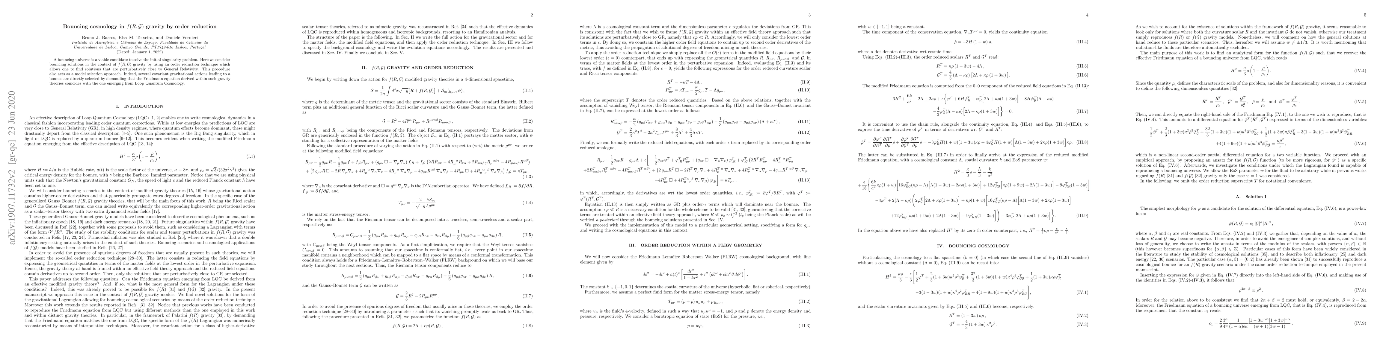 This paper explores bouncing cosmology solutions in $f(R,\mathcal{G})$ gravity using an order reduction technique to find solutions close to General Relativity, thereby addressing the initial singularity problem. The method also serves as a model selection tool by aligning the derived Friedmann equation with that of Loop Quantum Cosmology.