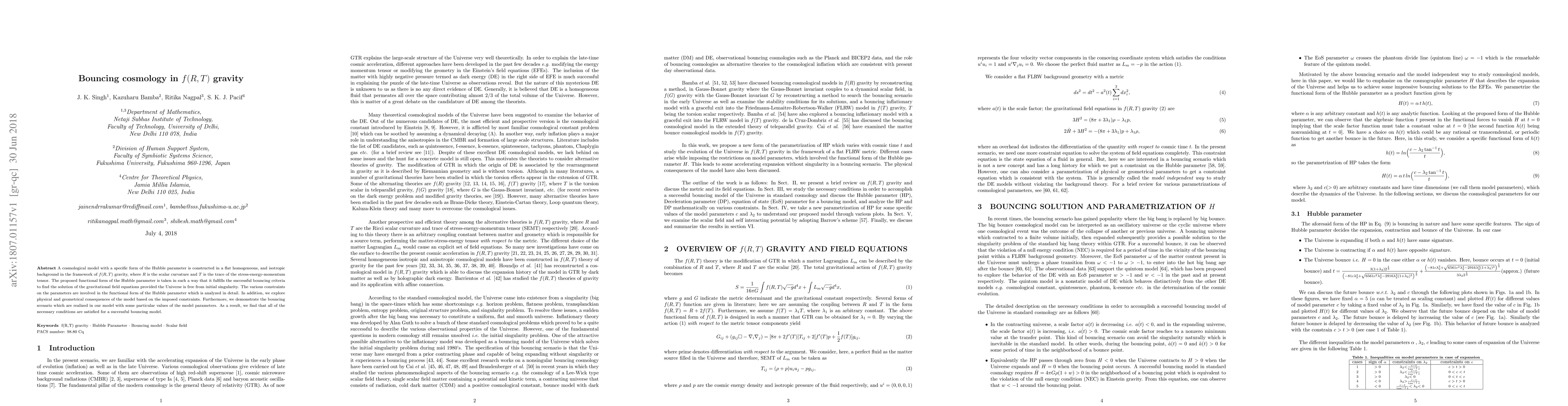 A cosmological model with a specific form of the Hubble parameter is constructed in a flat homogeneous, and isotropic background in the framework of $f(R, T)$ gravity, where $R$ is the scalar curvature and $T$ is the trace of the stress-energy-momentum tensor. The proposed functional form of the Hubble parameter is taken in such a way that it fulfills the successful bouncing criteria to find the solution of the gravitational field equations provided the Universe is free from initial singularity. The various constraints on the parameters are involved in the functional form of the Hubble parameter which is analyzed in detail. In addition, we explore physical and geometrical consequences of the model based on the imposed constraints. Furthermore, we demonstrate the bouncing scenario which are realized in our model with some particular values of the model parameters. As a result, we find that all of the necessary conditions are satisfied for a successful bouncing model.