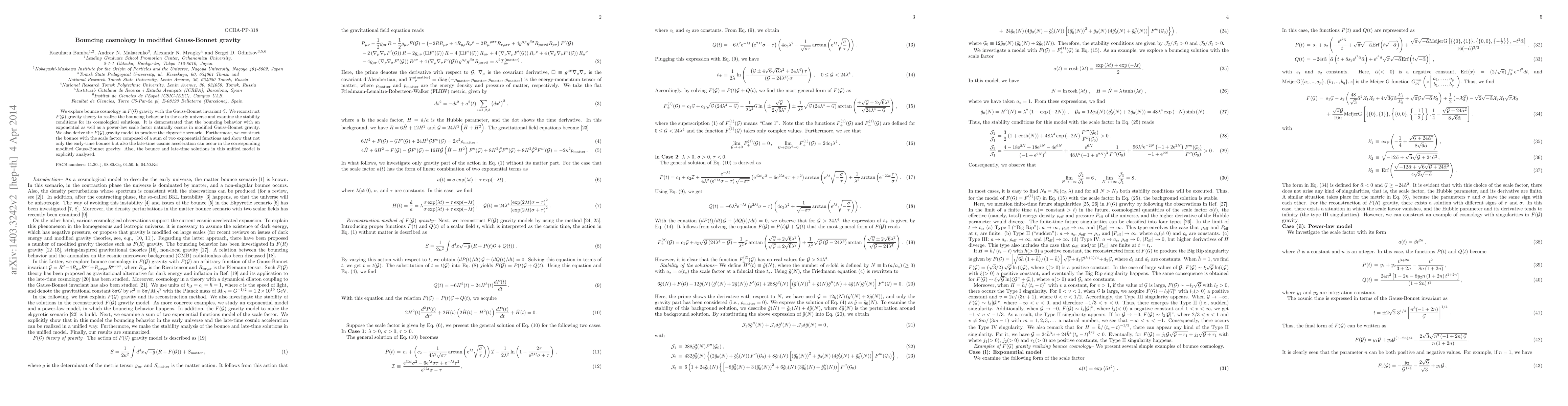 The paper presents explicit analytical reconstructions of F(G) gravity models that unify early-time bouncing behavior with late-time cosmic acceleration, along with stability analysis.