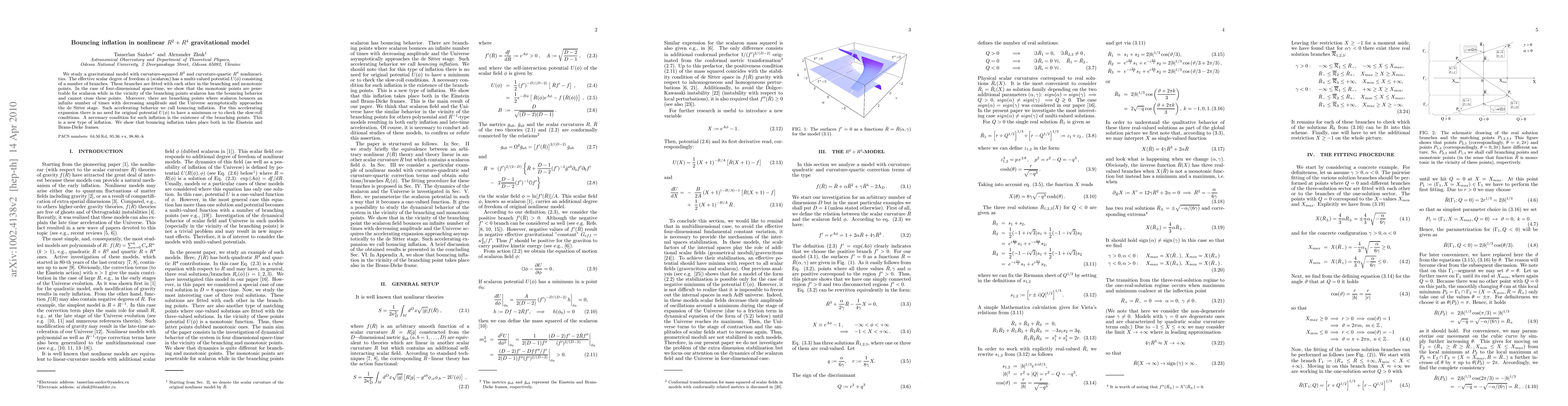 We study a gravitational model with curvature-squared $R^2$ and curvature-quartic $R^4$ nonlinearities. The effective scalar degree of freedom $\phi$ (scalaron) has a multi-valued potential $U(\phi)$ consisting of a number of branches. These branches are fitted with each other in the branching and monotonic points. In the case of four-dimensional space-time, we show that the monotonic points are penetrable for scalaron while in the vicinity of the branching points scalaron has the bouncing behavior and cannot cross these points. Moreover, there are branching points where scalaron bounces an infinite number of times with decreasing amplitude and the Universe asymptotically approaches the de Sitter stage. Such accelerating behavior we call bouncing inflation. For this accelerating expansion there is no need for original potential $U(\phi)$ to have a minimum or to check the slow-roll conditions. A necessary condition for such inflation is the existence of the branching points. This is a new type of inflation. We show that bouncing inflation takes place both in the Einstein and Brans-Dicke frames.