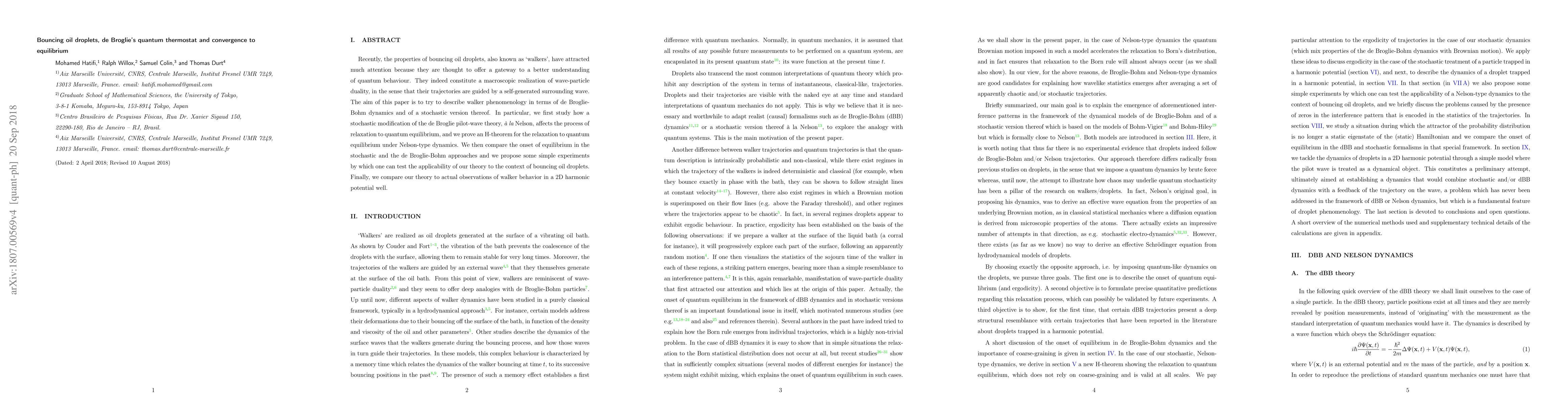 Recently, the properties of bouncing oil droplets, also known as "walkers", have attracted much attention because they are thought to offer a gateway to a better understanding of quantum behaviour. They constitute indeed a macroscopic realization of wave-particle duality, in the sense that their trajectories are guided by a self-generated surrounding wave. The aim of this paper is to develop a phenomenological theory for the behavior of walkers in terms of de Broglie-Bohm and Nelson dynamics. We study in particular how modifications of the de Broglie pilot-wave theory, \`a la Nelson, affect the process of relaxation to quantum equilibrium, and prove an H-theorem for the relaxation to quantum equilibrium under Nelson dynamics. We compare the onset of equilibrium in the Nelson and de Broglie-Bohm approaches and we also propose some simple experiments by which one can test the applicability of our theory to the context of bouncing oil droplets.