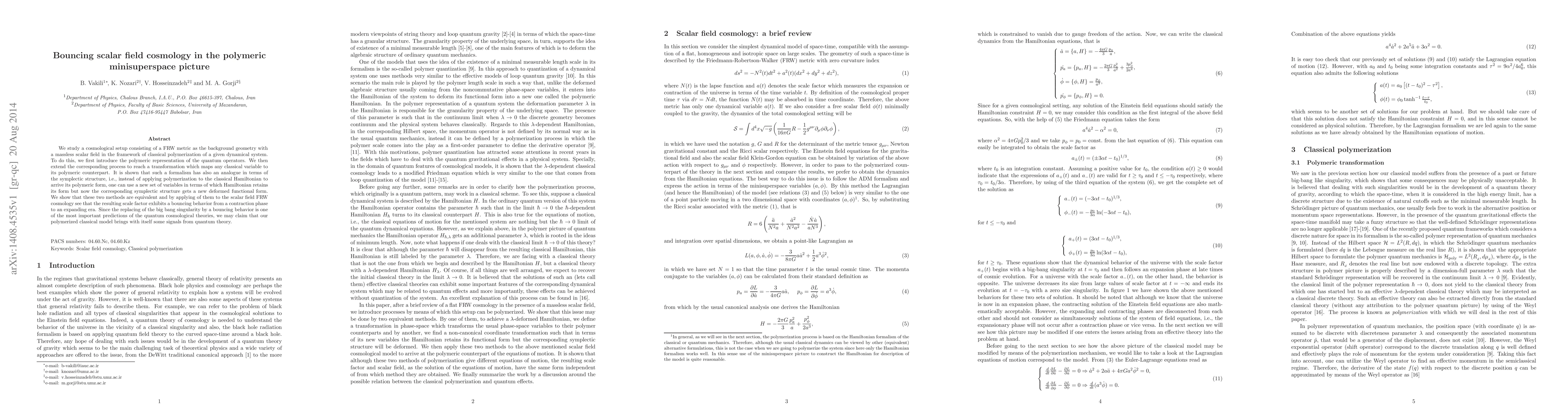We study a cosmological setup consisting of a FRW metric as the background geometry with a massless scalar field in the framework of classical polymerization of a given dynamical system. To do this, we first introduce the polymeric representation of the quantum operators. We then extend the corresponding process to reach a transformation which maps any classical variable to its polymeric counterpart. It is shown that such a formalism has also an analogue in terms of the symplectic structure, i.e., instead of applying polymerization to the classical Hamiltonian to arrive its polymeric form, one can use a new set of variables in terms of which Hamiltonian retains its form but now the corresponding symplectic structure gets a new deformed functional form. We show that these two methods are equivalent and by applying of them to the scalar field FRW cosmology see that the resulting scale factor exhibits a bouncing behavior from a contraction phase to an expanding era. Since the replacing of the big bang singularity by a bouncing behavior is one of the most important predictions of the quantum cosmological theories, we may claim that our polymerized classical model brings with itself some signals from quantum theory.