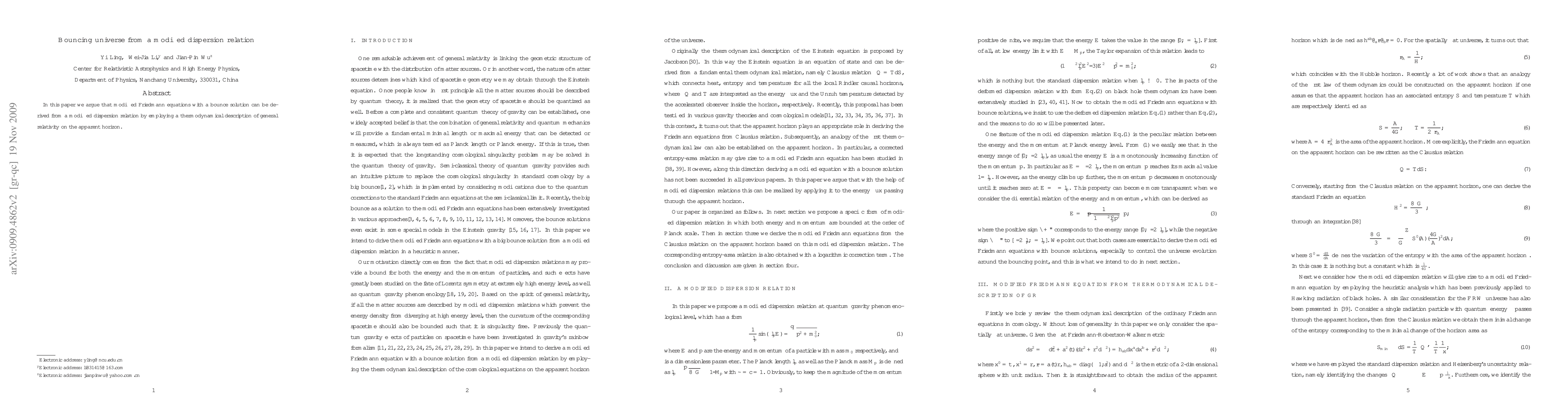 Summary: The paper proposes that a bouncing universe solution can be derived from modified Friedmann equations, which themselves stem from a modified dispersion relation, using a thermodynamical approach to general relativity on the apparent horizon. This approach suggests a potential mechanism for the universe's cyclic expansion and contraction.
