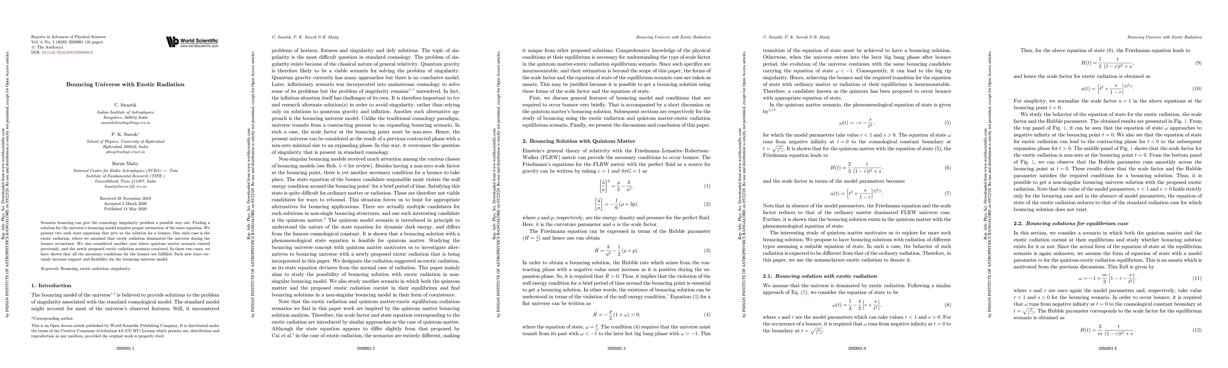 This paper explores cosmological bouncing scenarios that offer potential solutions to the singularity problem by estimating appropriate state equations. It introduces two state equations, including one for exotic radiation dominating during the universe's bounce, thereby supporting the flexibility and viability of the bouncing universe model.