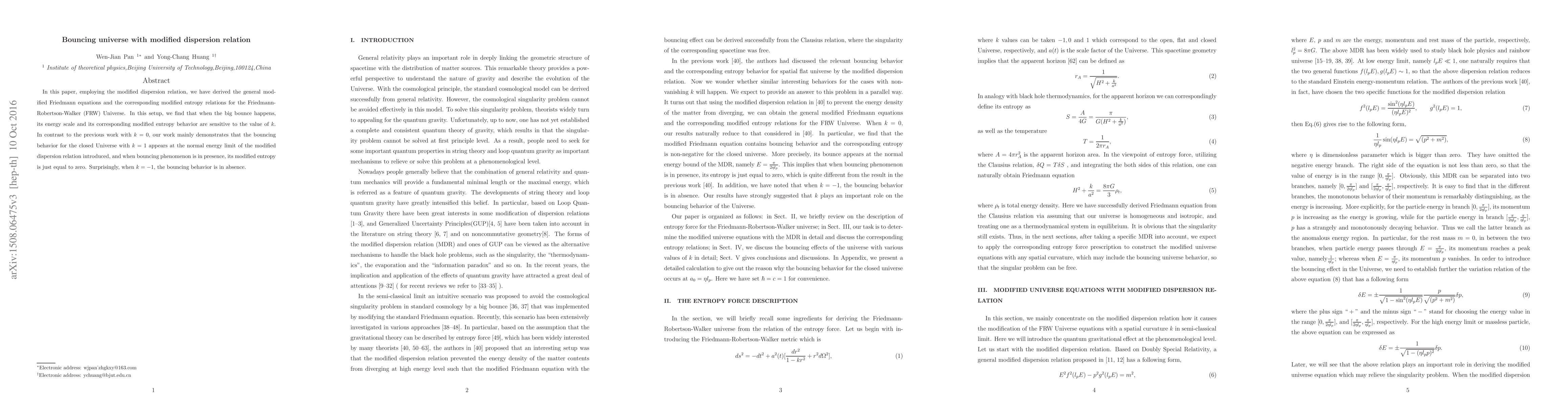This paper explores the bouncing universe scenario using a modified dispersion relation, deriving new Friedmann equations and entropy relations for a FRW Universe. It finds that a big bounce occurs at normal energy limits for a closed universe with $k=1$, leading to zero modified entropy, while no bouncing occurs for $k=-1$.