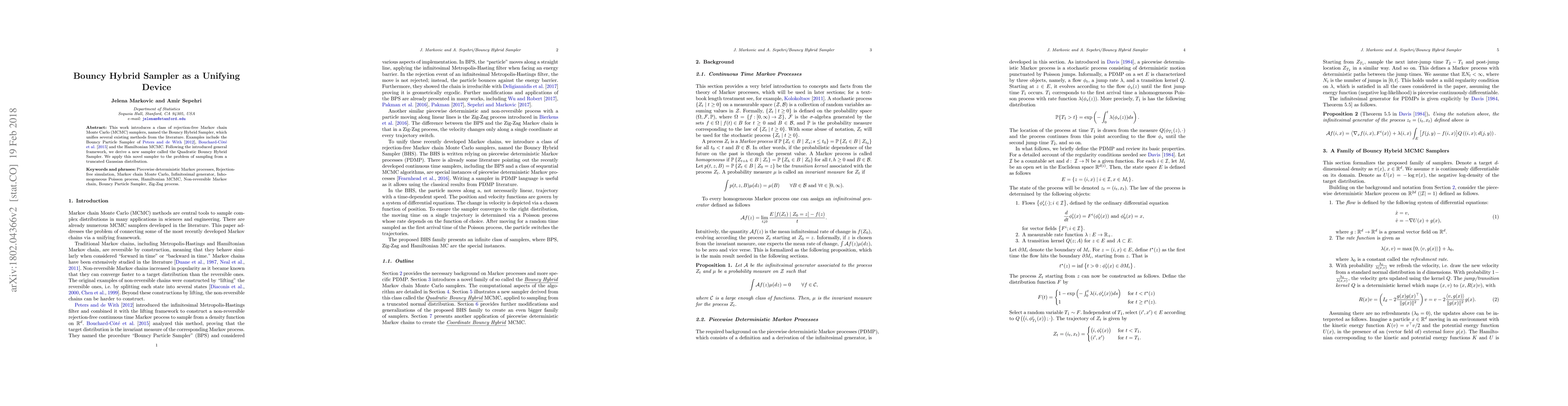 This paper presents the Bouncy Hybrid Sampler, a rejection-free MCMC framework that unifies various existing methods, including the Bouncy Particle Sampler and Hamiltonian MCMC. The authors introduce a new Quadratic Bouncy Hybrid Sampler and demonstrate its effectiveness in sampling from a truncated Gaussian distribution.