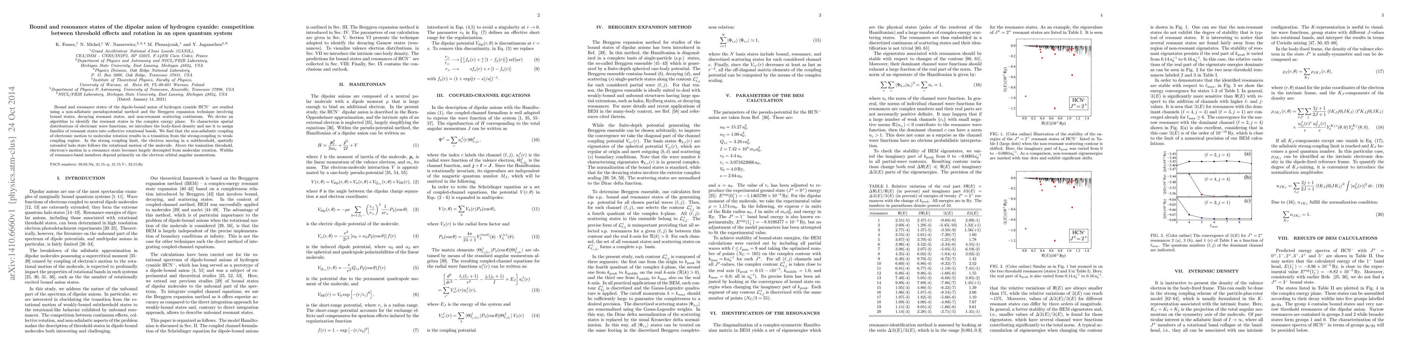 Bound and resonance states of the dipole-bound anion of hydrogen cyanide HCN$^-$ are studied using a non-adiabatic pseudopotential method and the Berggren expansion technique involving bound states, decaying resonant states, and non-resonant scattering continuum. We devise an algorithm to identify the resonant states in the complex energy plane. To characterize spatial distributions of electronic wave functions, we introduce the body-fixed density and use it to assign families of resonant states into collective rotational bands. We find that the non-adiabatic coupling of electronic motion to molecular rotation results in a transition from the strong-coupling to weak-coupling regime. In the strong coupling limit, the electron moving in a subthreshold, spatially extended halo state follows the rotational motion of the molecule. Above the ionization threshold, electron's motion in a resonance state becomes largely decoupled from molecular rotation. Widths of resonance-band members depend primarily on the electron orbital angular momentum.