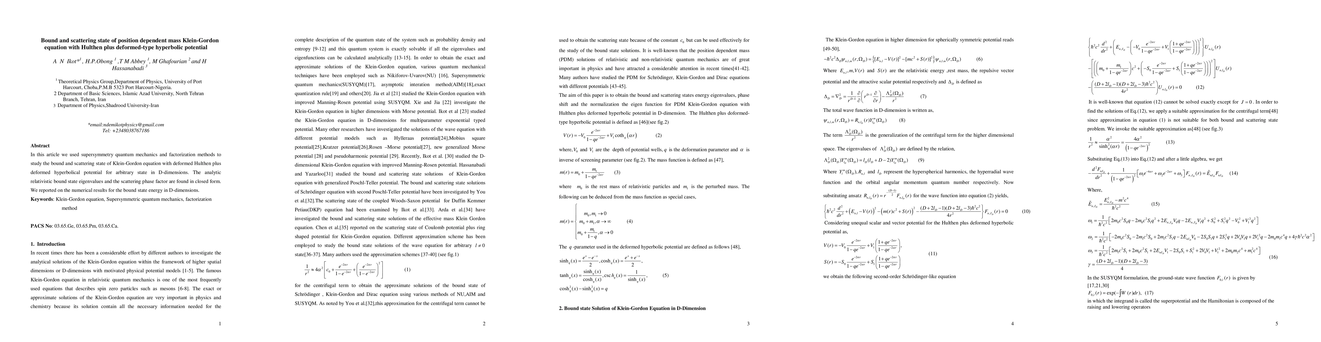In this article we used supersymmetry quantum mechanics and factorization methods to study the bound and scattering state of Klein-Gordon equation with deformed Hulthen plus deformed hyperbolical potential for arbitrary state in D-dimensions. The analytic relativistic bound state eigenvalues and the scattering phase factor are found in closed form. We reported on the numerical results for the bound state energy in D-dimensions.