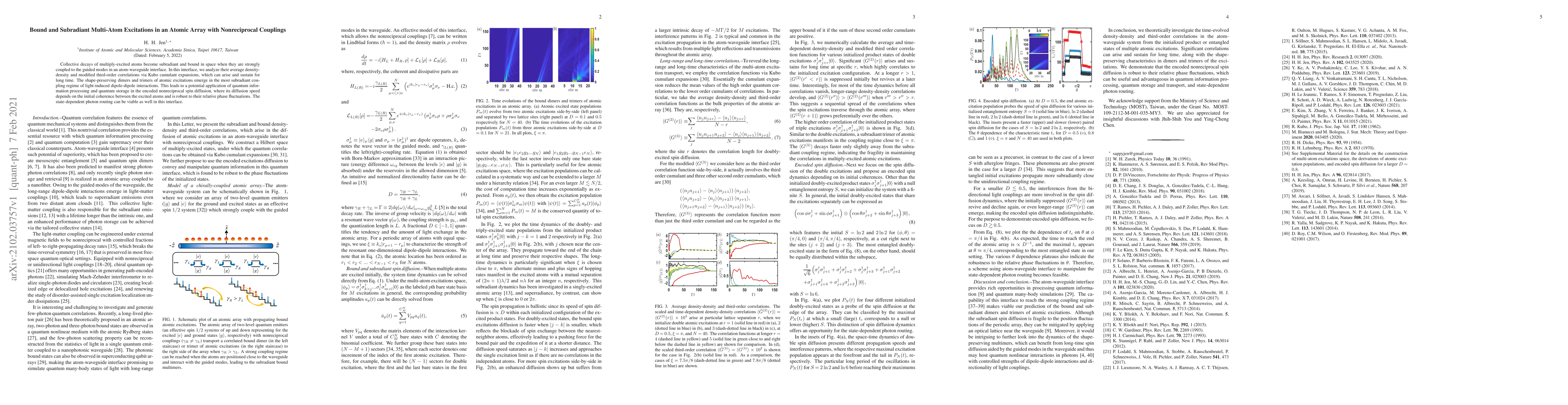 This paper investigates how strongly coupled atoms in an atomic array with nonreciprocal couplings lead to subradiant, bound multi-atom excitations. It explores the potential for quantum information processing and storage through shape-preserving dimers and trimers of atomic excitations, highlighting robustness against phase fluctuations.