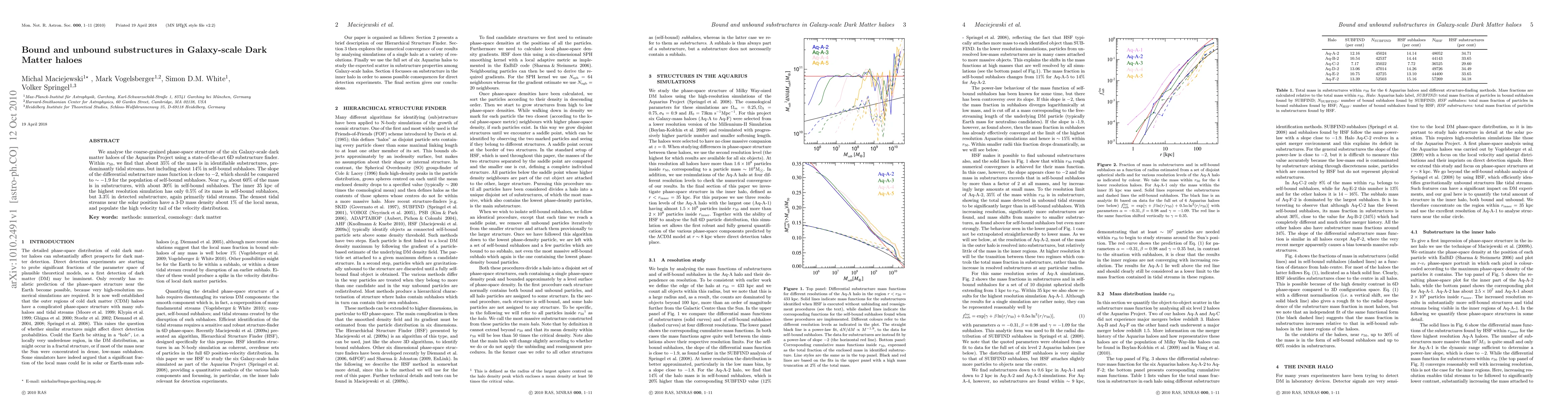 We analyse the coarse-grained phase-space structure of the six Galaxy-scale dark matter haloes of the Aquarius Project using a state-of-the-art 6D substructure finder. Within r_50, we find that about 35% of the mass is in identifiable substructures, predominantly tidal streams, but including about 14% in self-bound subhaloes. The slope of the differential substructure mass function is close to -2, which should be compared to around -1.9 for the population of self-bound subhaloes. Near r_50 about 60% of the mass is in substructures, with about 30% in self-bound subhaloes. The inner 35 kpc of the highest resolution simulation has only 0.5% of its mass in self-bound subhaloes, but 3.3% in detected substructure, again primarily tidal streams. The densest tidal streams near the solar position have a 3-D mass density about 1% of the local mean, and populate the high velocity tail of the velocity distribution.