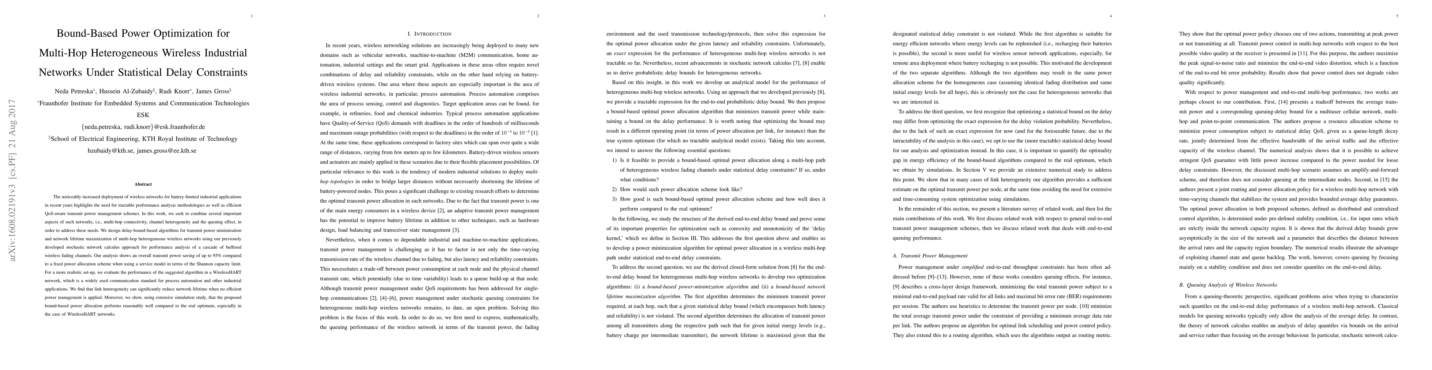 This paper proposes delay-bound-based algorithms for minimizing transmit power and maximizing network lifetime in multi-hop heterogeneous wireless industrial networks, leveraging stochastic network calculus. The approach achieves up to 95% power savings compared to fixed power allocation, and demonstrates effective performance in WirelessHART networks.