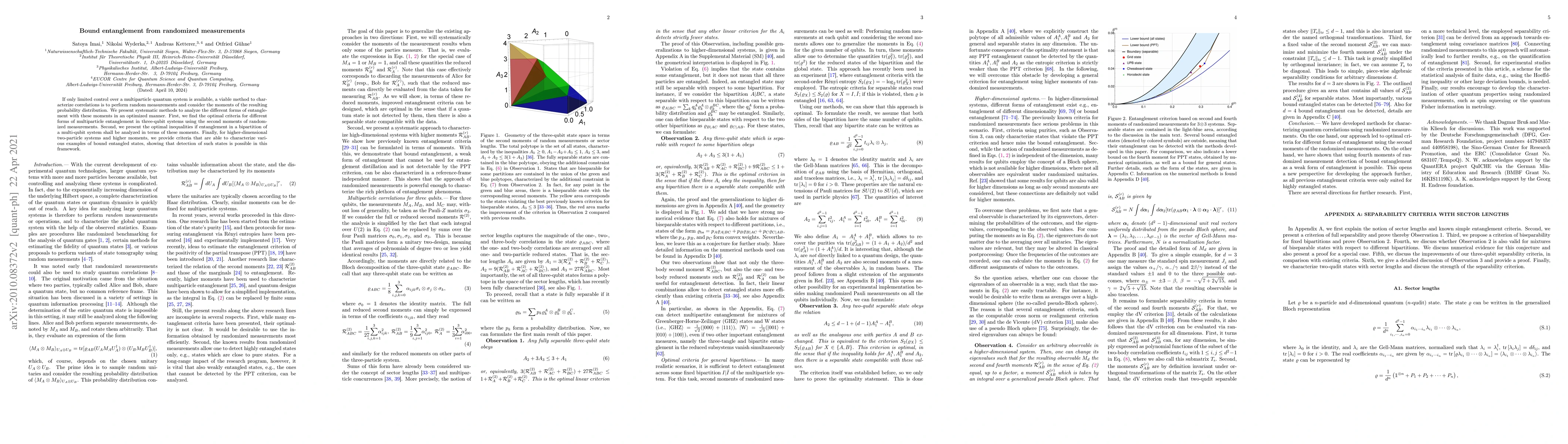 This paper develops systematic methods to analyze multiparticle quantum entanglement using randomized measurements, focusing on the second moments of the resulting probability distributions. It provides optimal criteria for characterizing different forms of entanglement in three-qubit systems and higher-dimensional systems, demonstrating the detection of bound entangled states.