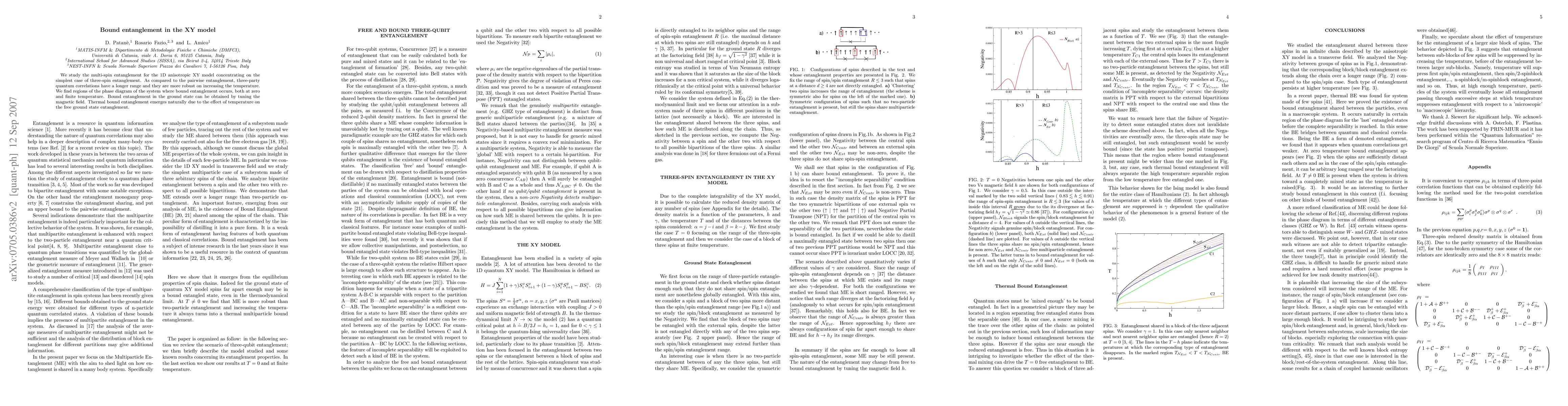 This paper investigates three-spin entanglement in the 1D anisotropic XY model, revealing that it extends beyond pairwise entanglement and is more resilient to temperature increases. The study identifies regions in the phase diagram where bound entanglement occurs, both at zero and finite temperatures, highlighting the role of magnetic field tuning and thermal effects.
