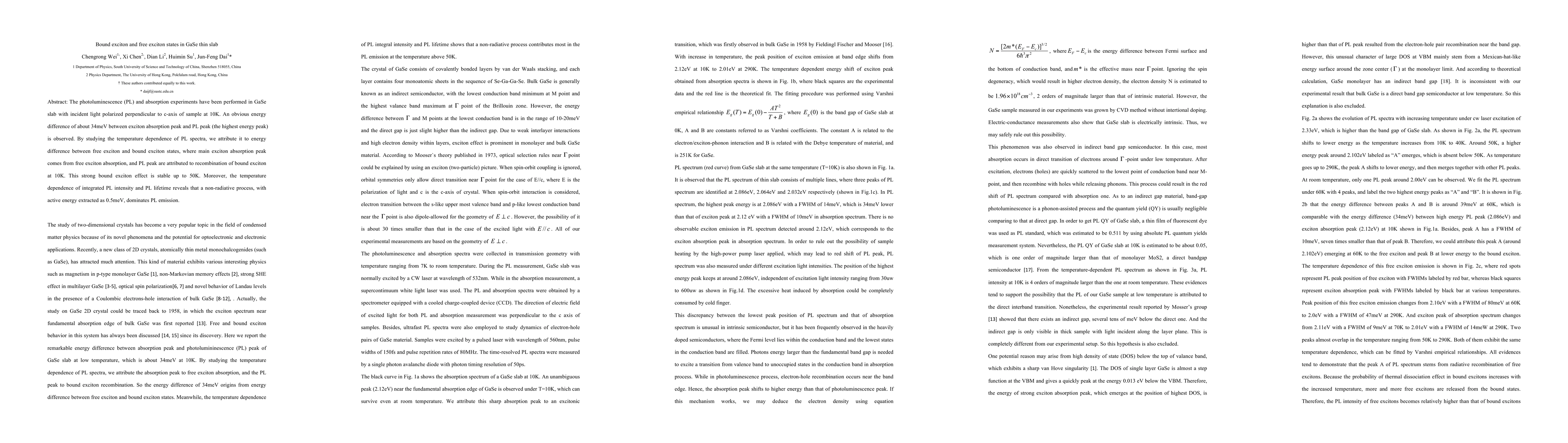 The study on GaSe thin slab reveals a 34meV energy difference between bound and free exciton states via PL and absorption experiments at 10K. This difference persists up to 50K, with bound excitons dominating recombination at low temperatures. A non-radiative process, extracting 0.5meV, is identified as the main PL emission mechanism.