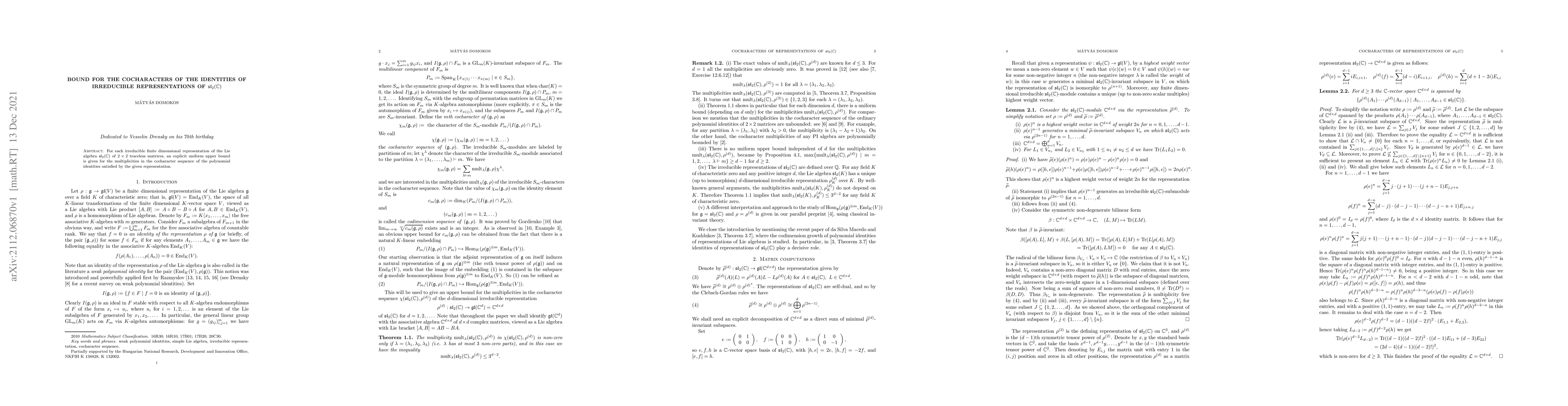 For each irreducible finite dimensional representation of the Lie algebra $\mathfrak{sl}_2(\mathbb{C})$ of $2\times 2$ traceless matrices, an explicit uniform upper bound is given for the multiplicities in the cocharacter sequence of the polynomial identities satisfied by the given representation.