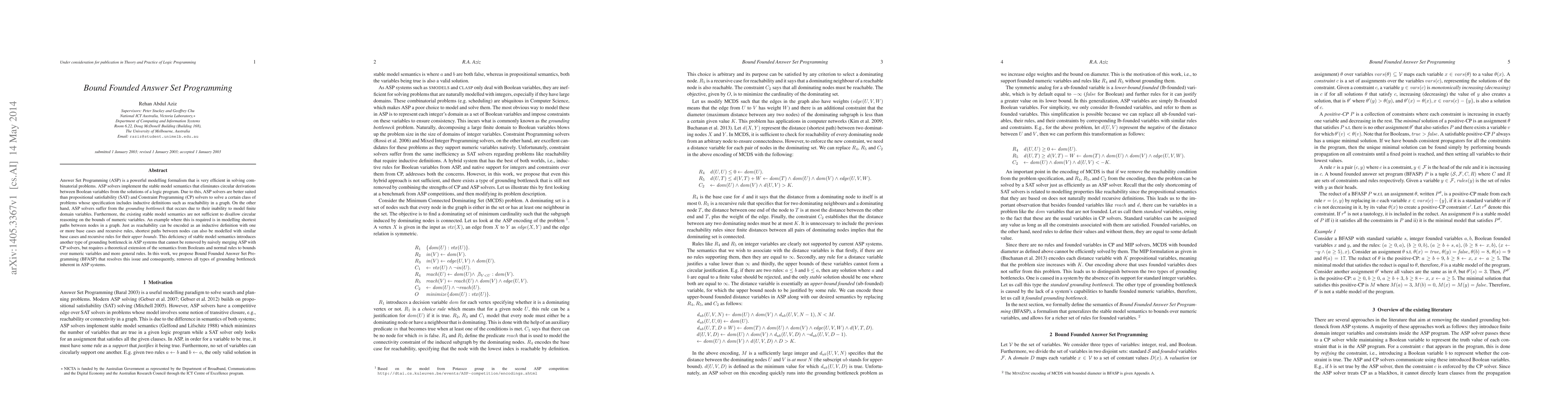 Answer Set Programming (ASP) is a powerful modelling formalism that is very efficient in solving combinatorial problems. ASP solvers implement the stable model semantics that eliminates circular derivations between Boolean variables from the solutions of a logic program. Due to this, ASP solvers are better suited than propositional satisfiability (SAT) and Constraint Programming (CP) solvers to solve a certain class of problems whose specification includes inductive definitions such as reachability in a graph. On the other hand, ASP solvers suffer from the grounding bottleneck that occurs due to their inability to model finite domain variables. Furthermore, the existing stable model semantics are not sufficient to disallow circular reasoning on the bounds of numeric variables. An example where this is required is in modelling shortest paths between nodes in a graph. Just as reachability can be encoded as an inductive definition with one or more base cases and recursive rules, shortest paths between nodes can also be modelled with similar base cases and recursive rules for their upper bounds. This deficiency of stable model semantics introduces another type of grounding bottleneck in ASP systems that cannot be removed by naively merging ASP with CP solvers, but requires a theoretical extension of the semantics from Booleans and normal rules to bounds over numeric variables and more general rules. In this work, we propose Bound Founded Answer Set Programming (BFASP) that resolves this issue and consequently, removes all types of grounding bottleneck inherent in ASP systems.