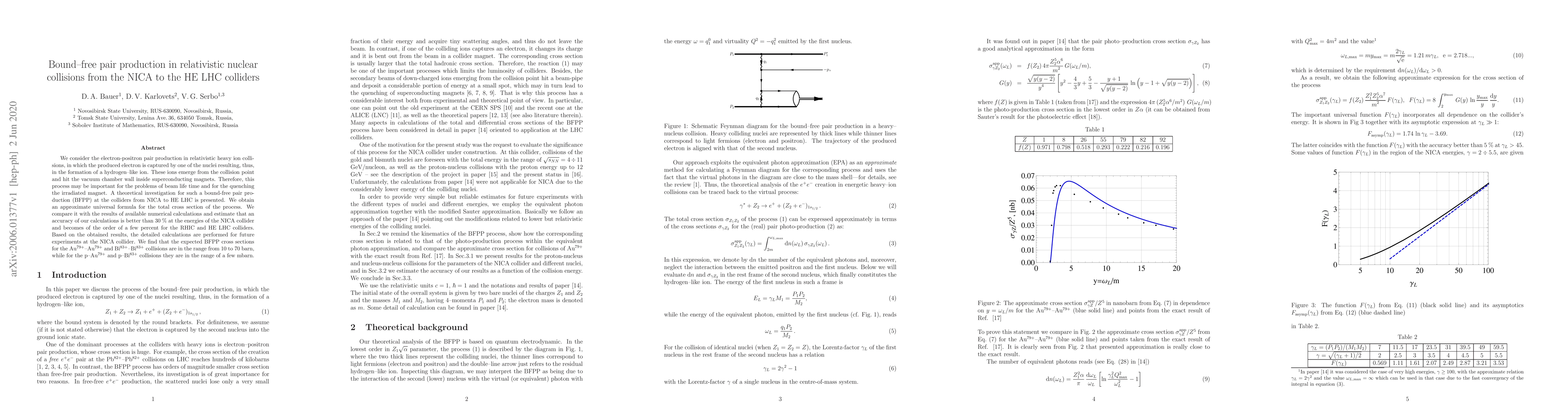 We consider the electron-positron pair production in relativistic heavy ion collisions, in which the produced electron is captured by one of the nuclei resulting, thus, in the formation of a hydrogen--like ion. These ions emerge from the collision point and hit the vacuum chamber wall inside superconducting magnets. Therefore, this process may be important for the problems of beam life time and for the quenching the irradiated magnet. A theoretical investigation for such a bound-free pair production (BFPP) at the colliders from NICA to HE LHC is presented. We obtain an approximate universal formula for the total cross section of the process. We compare it with the results of available numerical calculations and estimate that an accuracy of our calculations is better than $30$ % at the energies of the NICA collider and becomes of the order of a few percent for the RHIC and HE LHC colliders. Based on the obtained results, the detailed calculations are performed for future experiments at the NICA collider. We find that the expected BFPP cross sections for the Au$^{79+}$-Au$^{79+}$ and Bi$^{83+}$-Bi$^{83+}$ collisions are in the range from $10$ to $70$ barn, while for the p-Au$^{79+}$ and p-Bi$^{83+}$ collisions they are in the range of a few mbarn.