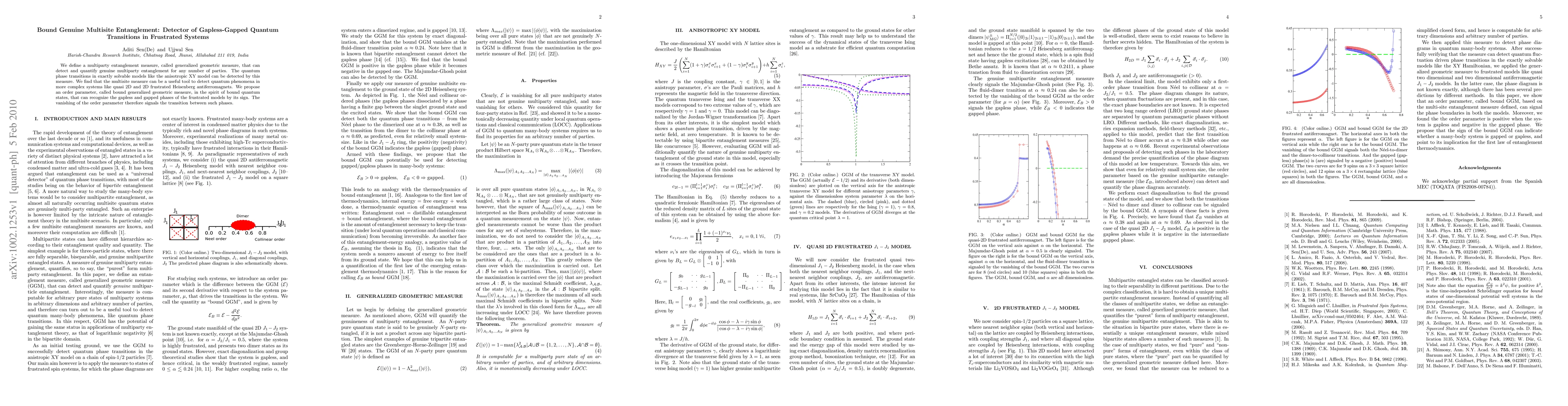 We define a multiparty entanglement measure, called generalized geometric measure, that can detect and quantify genuine multiparty entanglement for any number of parties. The quantum phase transitions in exactly solvable models like the anisotropic XY model can be detected by this measure. We find that the multisite measure can be a useful tool to detect quantum phenomena in more complex systems like quasi 2D and 2D frustrated Heisenberg antiferromagnets. We propose an order parameter, called bound generalized geometric measure, in the spirit of bound quantum states, that can recognize the gapless and gapped phases of the frustrated models by its sign. The vanishing of the order parameter therefore signals the transition between such phases.