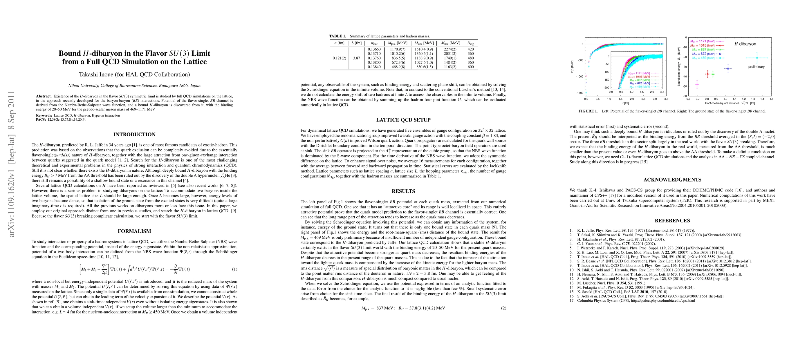 Summary: A full QCD lattice simulation reveals the existence of a bound H-dibaryon in the flavor SU(3) limit, with a binding energy of 20--50 MeV for pseudo-scalar meson masses ranging from 469 to 1171 MeV. The potential is derived from the Nambu-Bethe-Salpeter wave function.