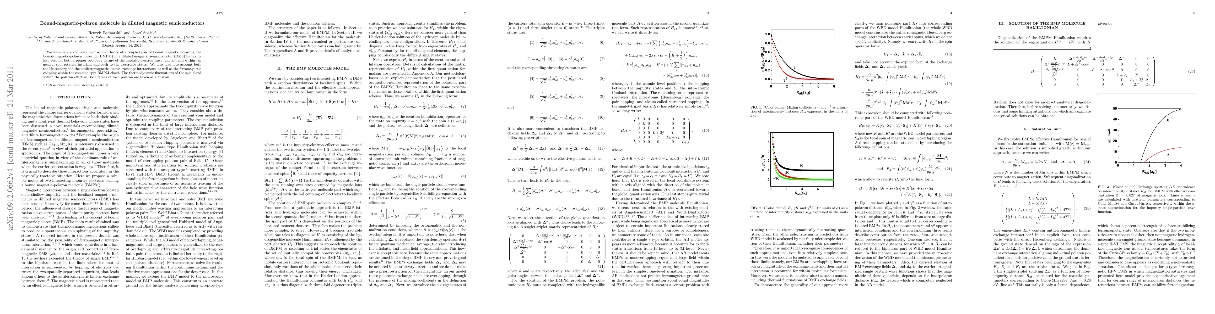 We formulate a complete microscopic theory of a coupled pair of bound magnetic polarons, the bound-magnetic-polaron molecule (BMPM) in a diluted magnetic semiconductor (DMS) by taking into account both a proper two-body nature of the impurity-electron wave function and within the general spin-rotation-invariant approach to the electronic states. We also take into account both the Heisenberg and the antiferromagnetic kinetic-exchange interactions, as well as the ferromagnetic coupling within the common spin BMPM cloud. The thermodynamic fluctuations of the spin cloud within the polaron effective Bohr radius of each polaron are taken as Gaussian.