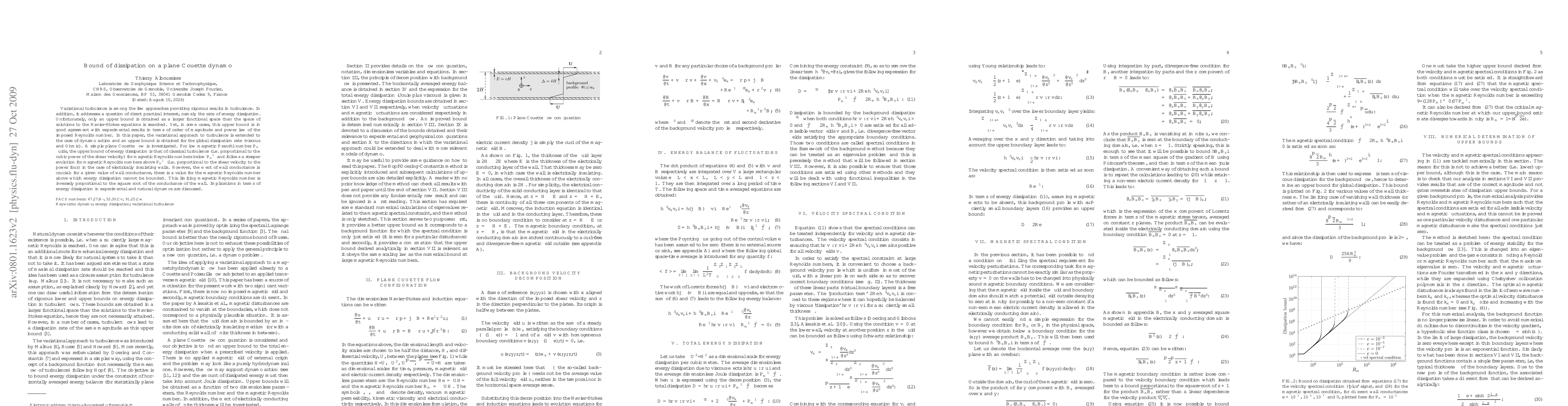 Variational turbulence is among the few approaches providing rigorous results in turbulence. In addition, it addresses a question of direct practical interest, namely the rate of energy dissipation. Unfortunately, only an upper bound is obtained as a larger functional space than the space of solutions to the Navier-Stokes equations is searched. Yet, in general, this upper bound is in good agreement with experimental results in terms of order of magnitude and power law of the imposed Reynolds number. In this paper, the variational approach to turbulence is extended to the case of dynamo action and an upper bound is obtained for the global dissipation rate (viscous and Ohmic). A simple plane Couette flow is investigated. For low magnetic Prandtl number $P_m$ fluids, the upper bound of energy dissipation is that of classical turbulence (i.e. proportional to the cubic power of the shear velocity) for magnetic Reynolds numbers below $P_m^{-1}$ and follows a steeper evolution for magnetic Reynolds numbers above $P_m^{-1}$ (i.e. proportional to the shear velocity to the power four) in the case of electrically insulating walls. However, the effect of wall conductance is crucial : for a given value of wall conductance, there is a value for the magnetic Reynolds number above which energy dissipation cannot be bounded. This limiting magnetic Reynolds number is inversely proportional to the square root of the conductance of the wall. Implications in terms of energy dissipation in experimental and natural dynamos are discussed.