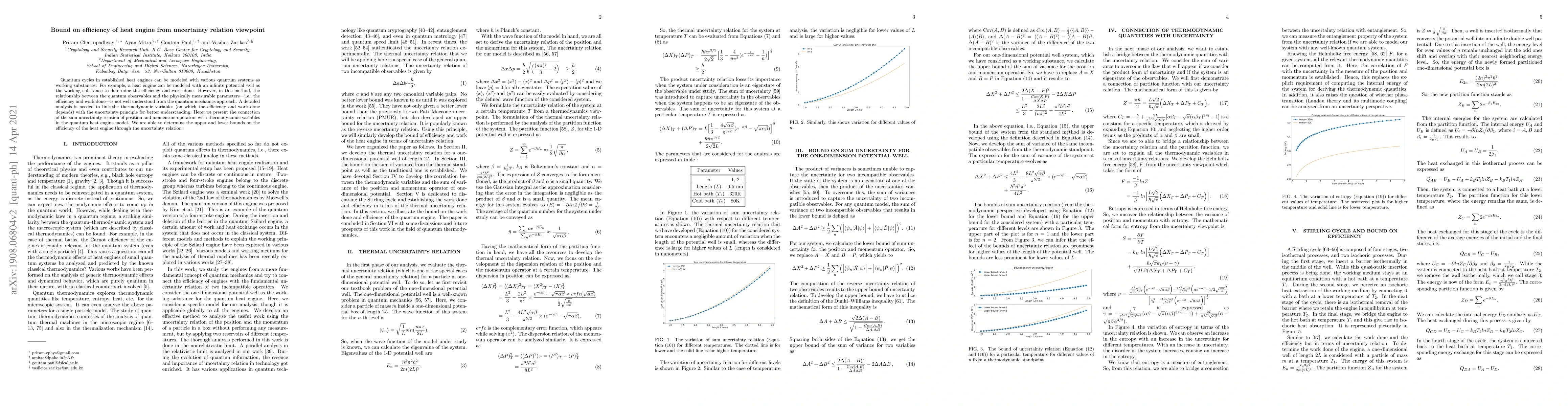 Quantum cycles in established heat engines can be modeled with various quantum systems as working substances. For example, a heat engine can be modeled with an infinite potential well as the working substance to determine the efficiency and work done. However, in this method, the relationship between the quantum observables and the physically measurable parameters i.e., the efficiency and work done is not well understood from the quantum mechanics approach. A detailed analysis is needed to link the thermodynamic variables (on which the efficiency and work done depends) with the uncertainty principle for better understanding. Here, we present the connection of the sum uncertainty relation of position and momentum operators with thermodynamic variables in the quantum heat engine model. We are able to determine the upper and lower bounds on the efficiency of the heat engine through the uncertainty relation.