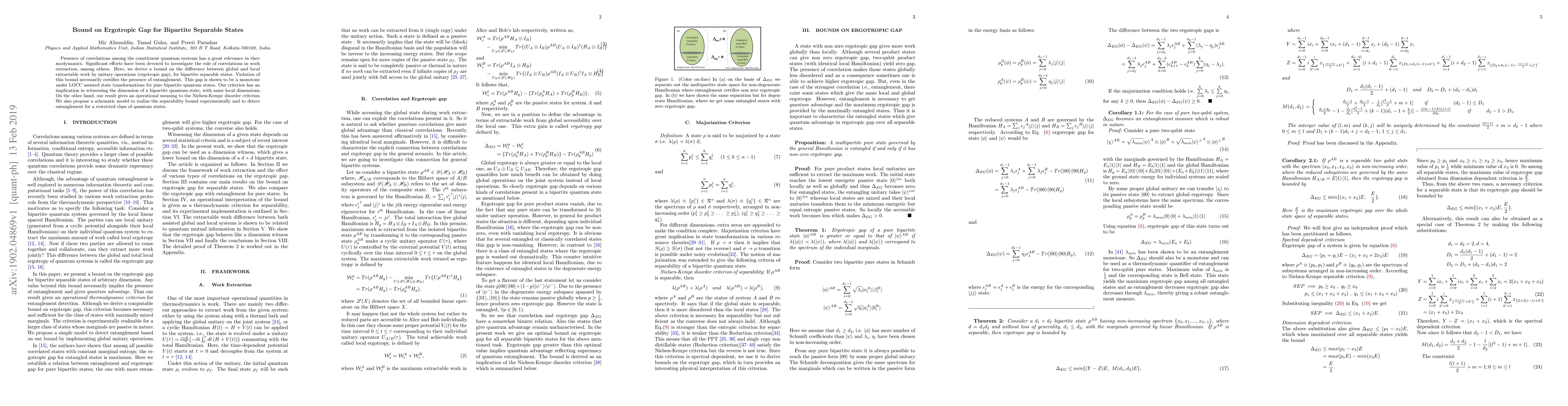 This paper derives a bound on the ergotropic gap for bipartite separable states, showing that its violation certifies entanglement presence. The gap is a monotone under LOCC transformations and has implications for witnessing the dimension of bipartite quantum states.