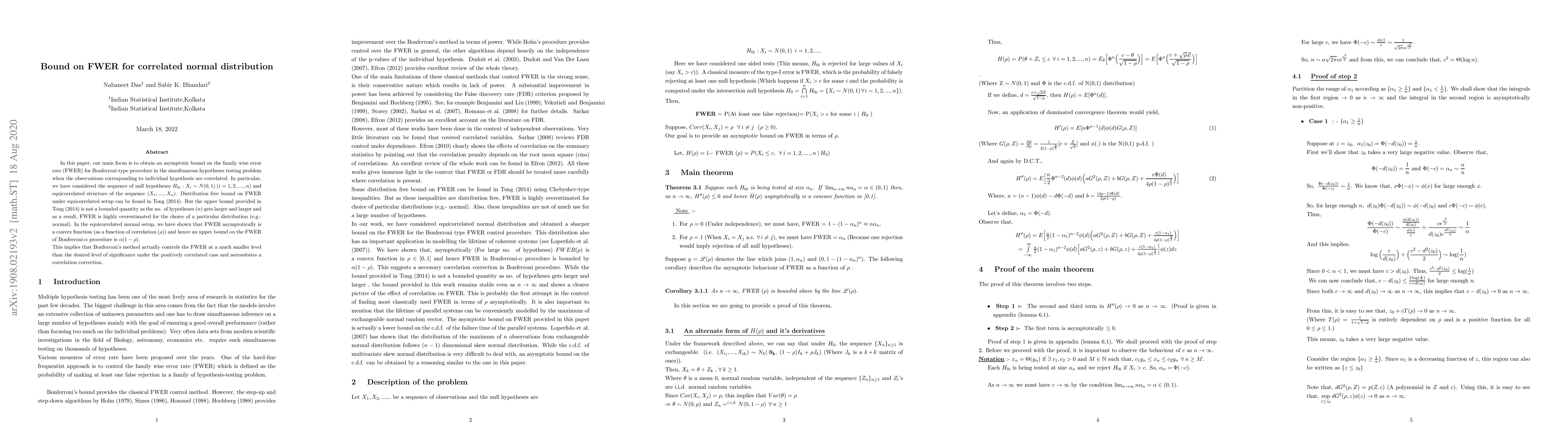 In this paper,our main focus is to obtain an asymptotic bound on the family wise error rate (FWER) for Bonferroni-type procedure in the simultaneous hypotheses testing problem when the observations corresponding to individual hypothesis are correlated. In particular, we have considered the sequence of null hypotheses H_{0i} : X_i follows N(0,1) , (i=1,2,....,n) and equicorrelated structure of the sequence (X_1,....,X_n). Distribution free bound on FWER under equicorrelated setup can be found in Tong(2014). But the upper bound provided in Tong(2014) is not a bounded quantity as the no. of hypotheses(n) gets larger and larger and as a result,FWER is highly overestimated for the choice of a particular distribution (e.g.- normal). In the equicorrelated normal setup, we have shown that FWER asymptotically is a convex function (as a function of correlation (rho)) and hence an upper bound on the FWER of Bonferroni-(alpha) procedure is alpha(1-\rho).This implies,Bonferroni's method actually controls the FWER at a much smaller level than the desired level of significance under the positively correlated case and necessitates a correlation correction.