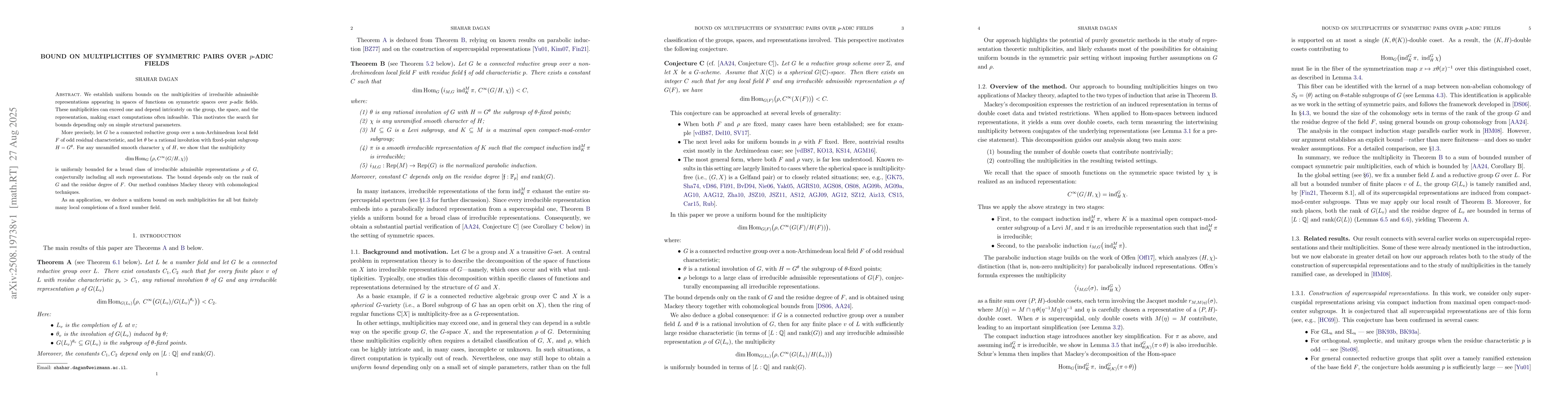 We establish uniform bounds on the multiplicities of irreducible admissible representations appearing in spaces of functions on symmetric spaces over $p$-adic fields. These multiplicities can exceed one and depend intricately on the group, the space, and the representation, making exact computations often infeasible. This motivates the search for bounds depending only on simple structural parameters. More precisely, let $G$ be a connected reductive group over a non-Archimedean local field $F$ of odd residual characteristic, and let $\theta$ be a rational involution with fixed-point subgroup $H = G^\theta$. For any unramified smooth character $\chi$ of $H$, we show that the multiplicity \[ \dim \mathrm{Hom}_G(\rho, C^\infty(G/H,\chi)) \] is uniformly bounded for a broad class of irreducible admissible representations $\rho$ of $G$, conjecturally including all such representations. The bound depends only on the rank of $G$ and the residue degree of $F$. Our method combines Mackey theory with cohomological techniques. As an application, we deduce a uniform bound on such multiplicities for all but finitely many local completions of a fixed number field.